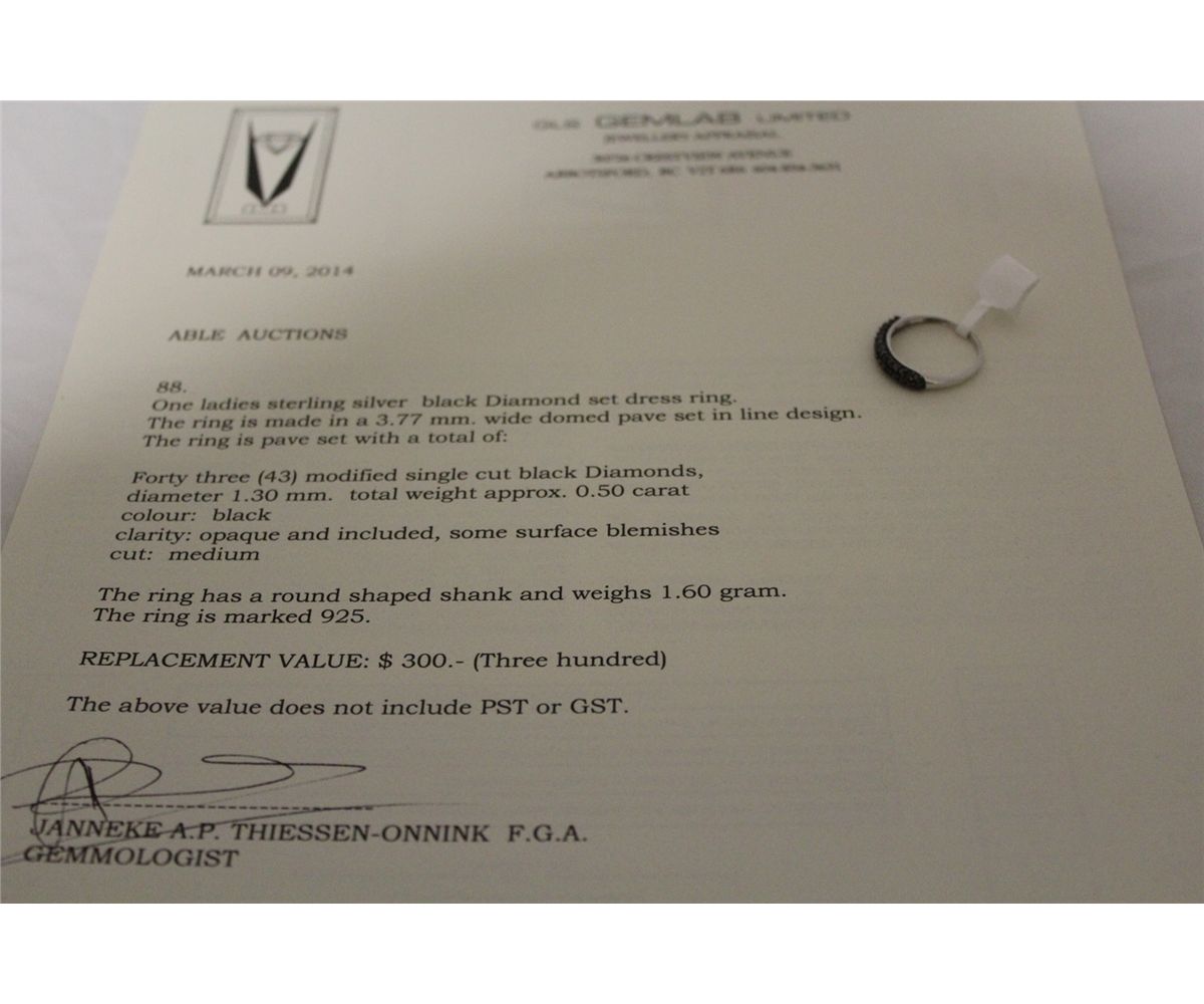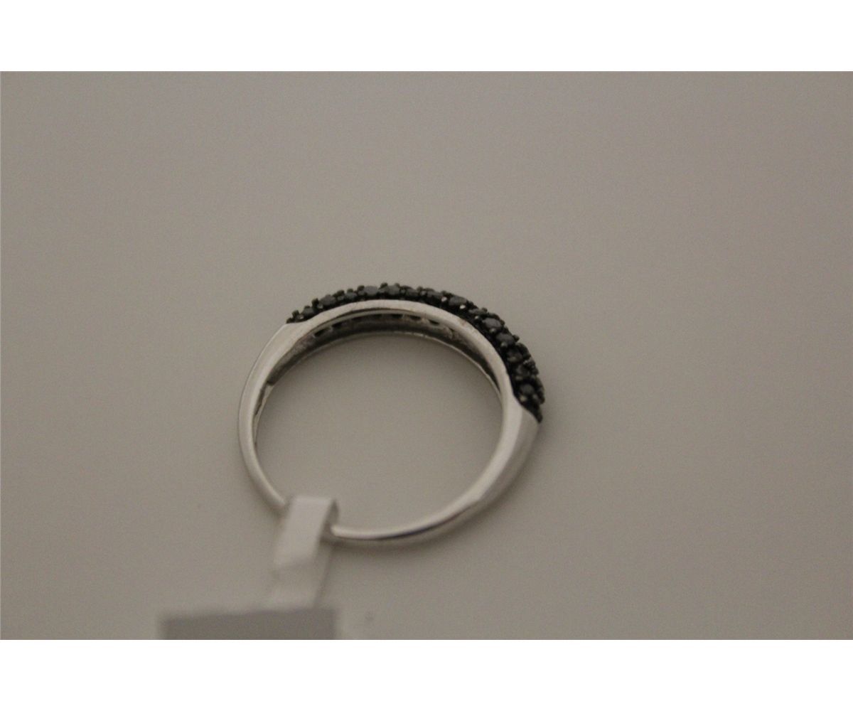 ONE LADIES STERLING SILVER BLACK DIAMOND SET DRESS RING. 3.77MM WIDE DOMED PAVE SET IN LINE DESIGN. 43 MODIFIED SINGLE CUT BLACK DIAMONDS, 1.30MM DIAMETER, WEIGHT APPROX 0.50CARAT REPLACEMENT VALUE $300.00