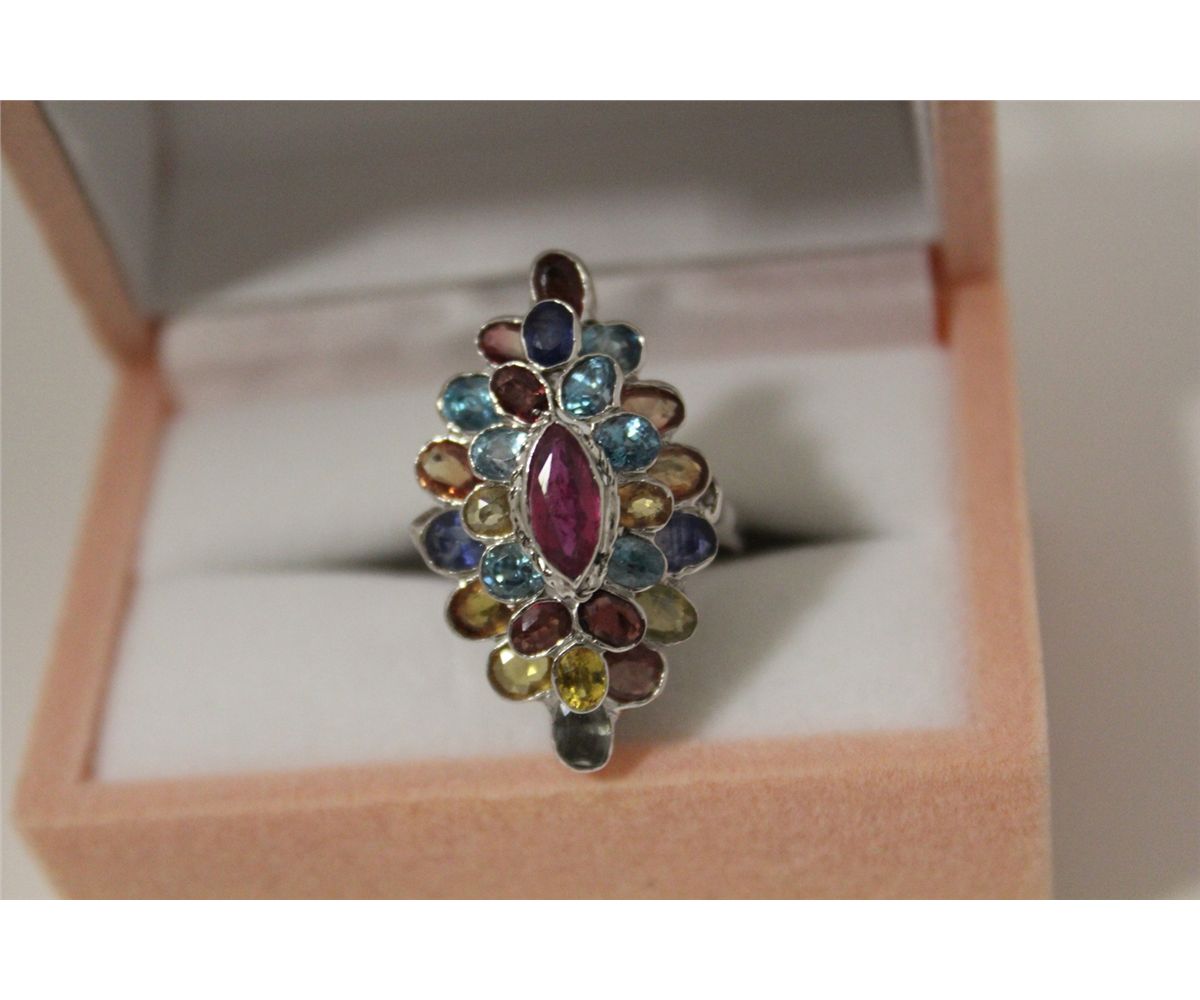 ONE LADIES STERLING SILVER COLOURED GEMSTONE SET COCKTAIL STYLE RING. THE RING IS BEZEL SET WITH A TOTAL OF 7 OVAL MIXED CUT NATURAL BLUE ZIRCONS 19 OVAL MIXED CUT SAPPHIRES AND 1 MARQUISE SHAPED GLASS FILLED RUBY. WEIGHT 7.10 GRAM. INCL. GEMMOLOGIST APPRAISAL OF $1350