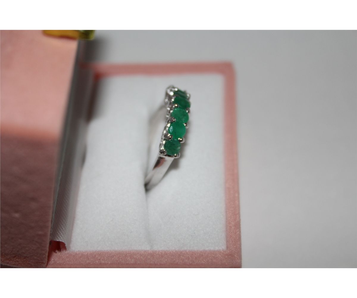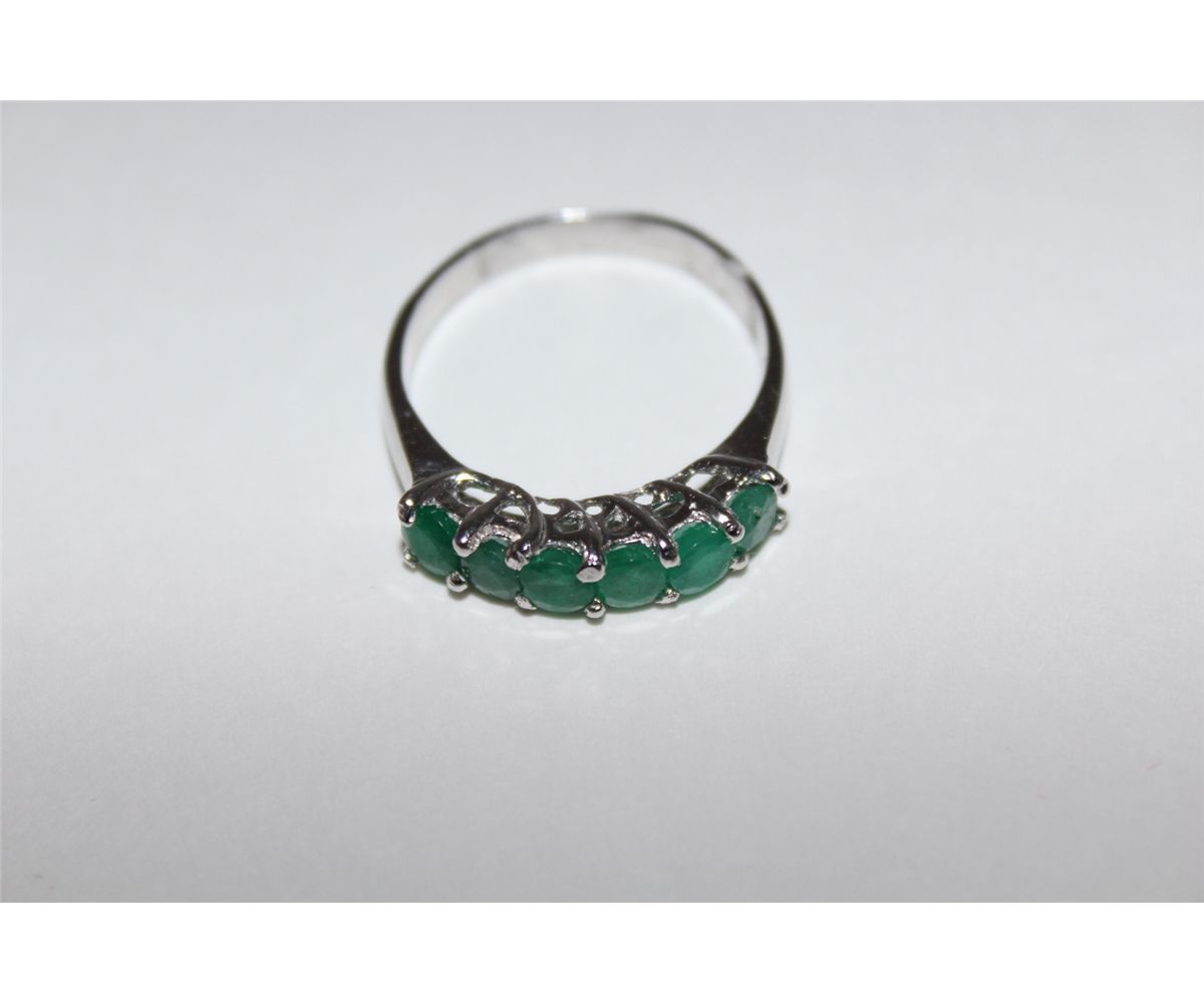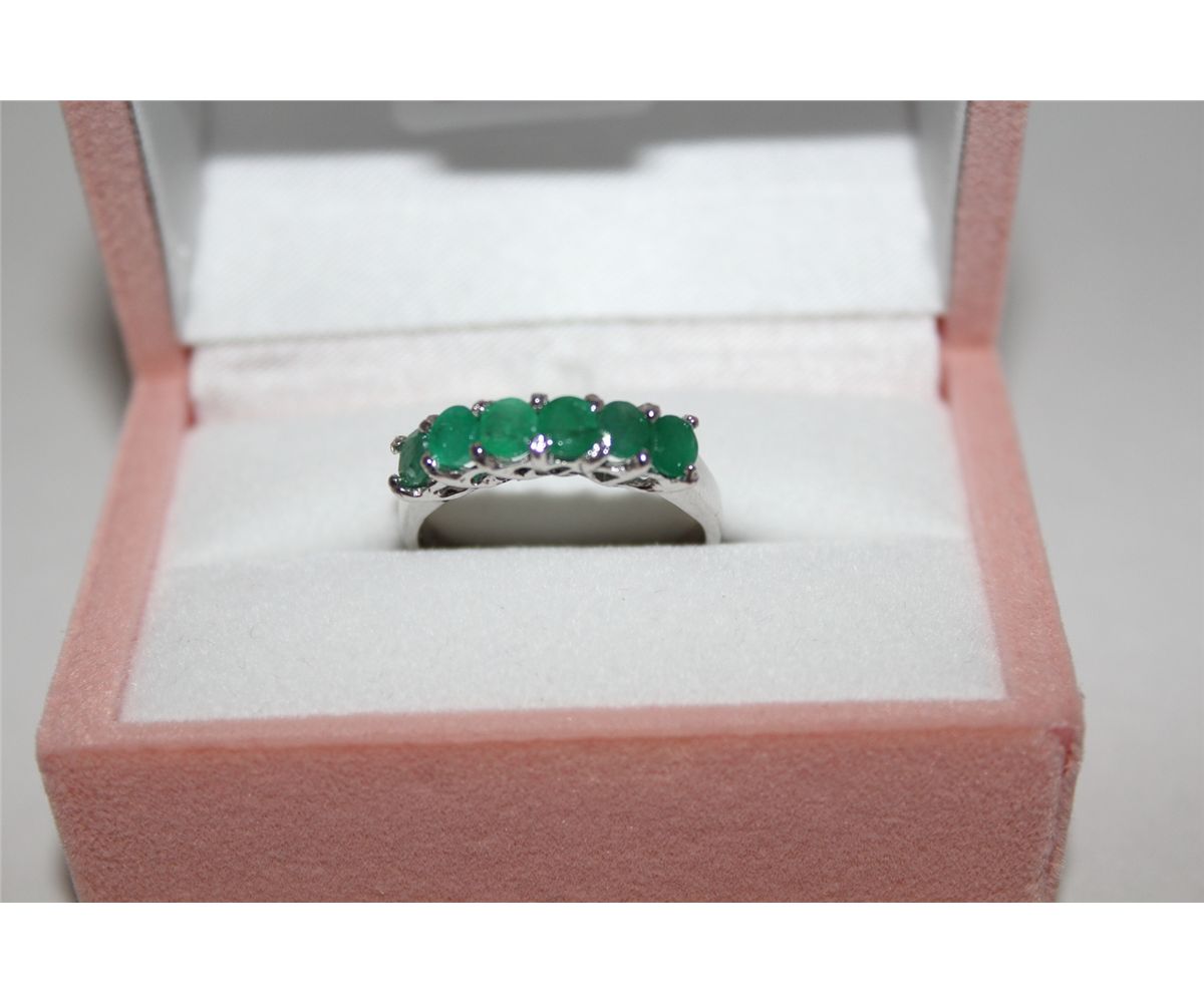 ONE LADIES STERLING SILVER FIVE (5) STONE EMERALD CUSTOM MADE RING, SET WITH FIVE (5) ROUND SHAPE NATURAL EMERALDS 0.70 CARATS. MED-GREEN, MI-HI CLARITY, 3.0 GRAMS INCL. DIAMOND GRADER APPRAISAL