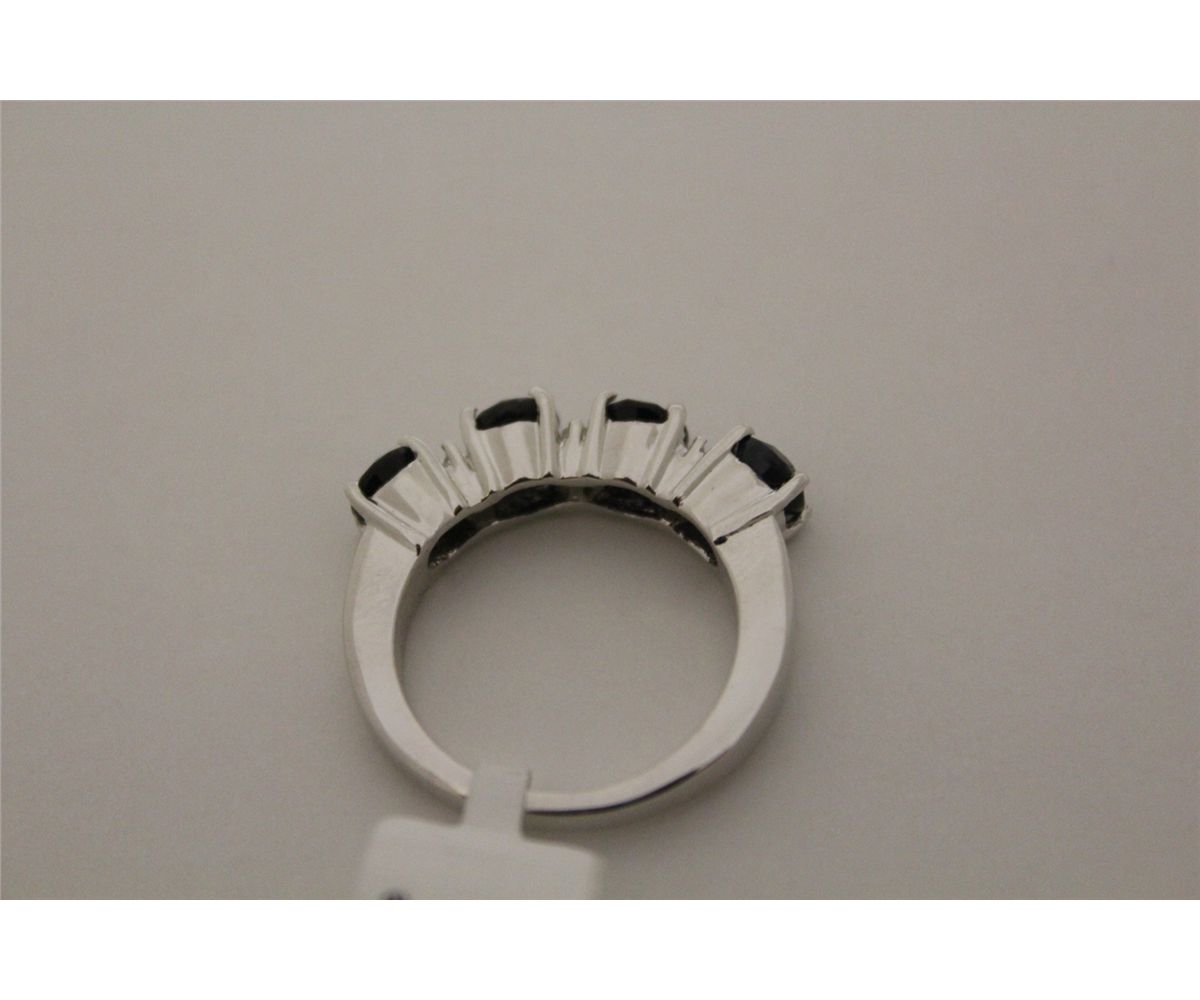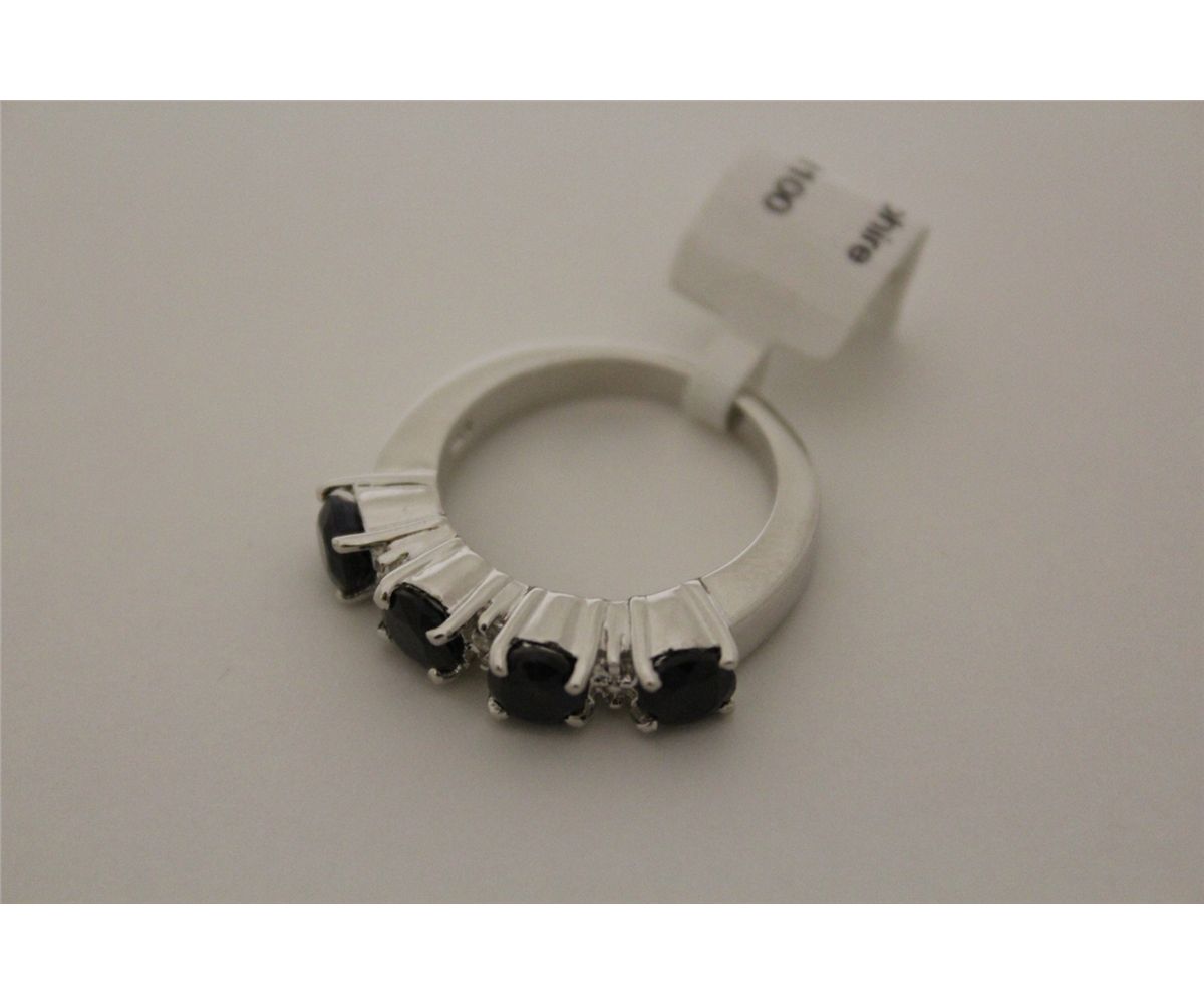 ONE LADIES STERLING SILVER NATURAL BLACK AND BLUE SAPPHIRE DRESS RING. 2 WHITE SAPPHIRES IN THREE CLAW SETTING. RING HAS A ROUND SHAPED SHANK AND WEIGHS 5.60 GRAM REPLACEMENT VALUE $150.00
