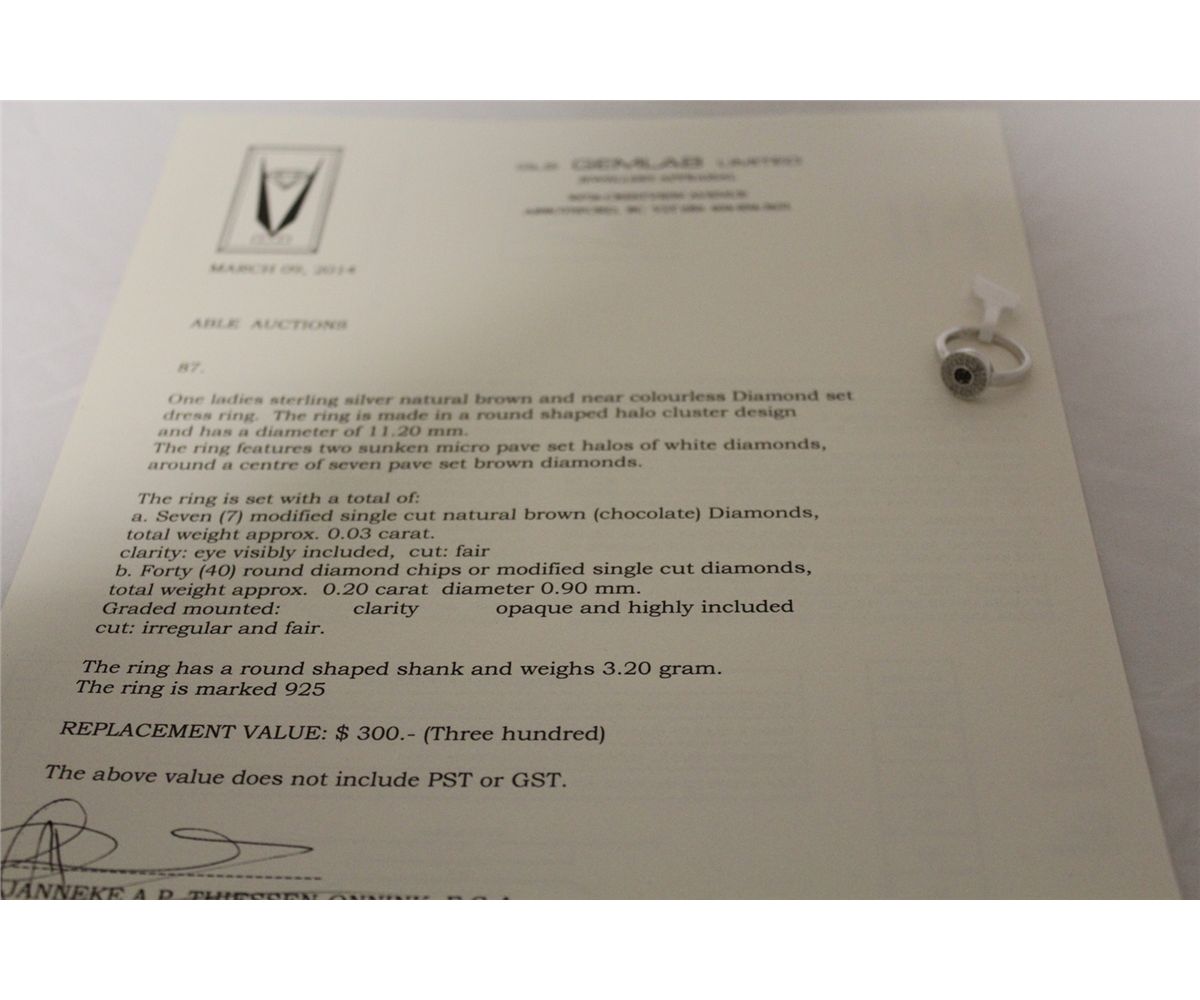 ONE LADIES STERLING SILVER NATURAL BROWN AND NEAR COLOURLESS DIAMOND SET DRESS RING.  7 SINGLE CUT BROWN DIAMONDS. 40 ROUND DIAMOND CHIPS. THE RING HAS A ROUND SHAPED SHANK AND WEIGHS 3.20 GRAMS. RING IS MARKED 925 REPLACEMENT VALUE $300.00