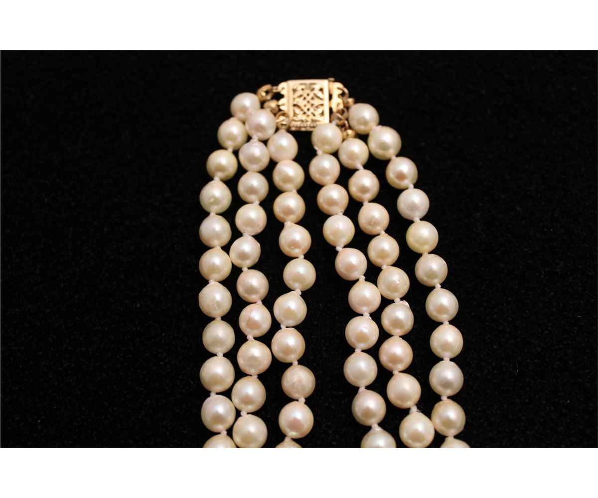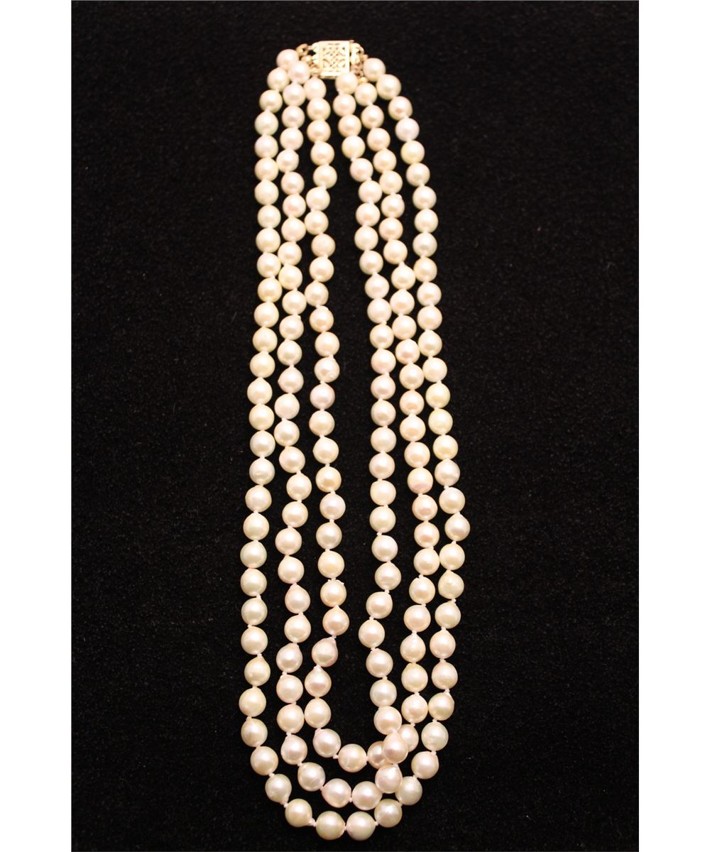ONE LADIES TRIPLE STRAND CULTURED PEARL NECKLACE, CONTAINS NUMEROUS CULTURED PEARLS OF WHITISH-CREAMISH BODY COLOUR. GOOD LUSTRE AND NACRE THICKNESS. WITH 14KT YELLOW GOLD BOX STYLE CLASP INCL. GEMOLOGIST APPRAISAL