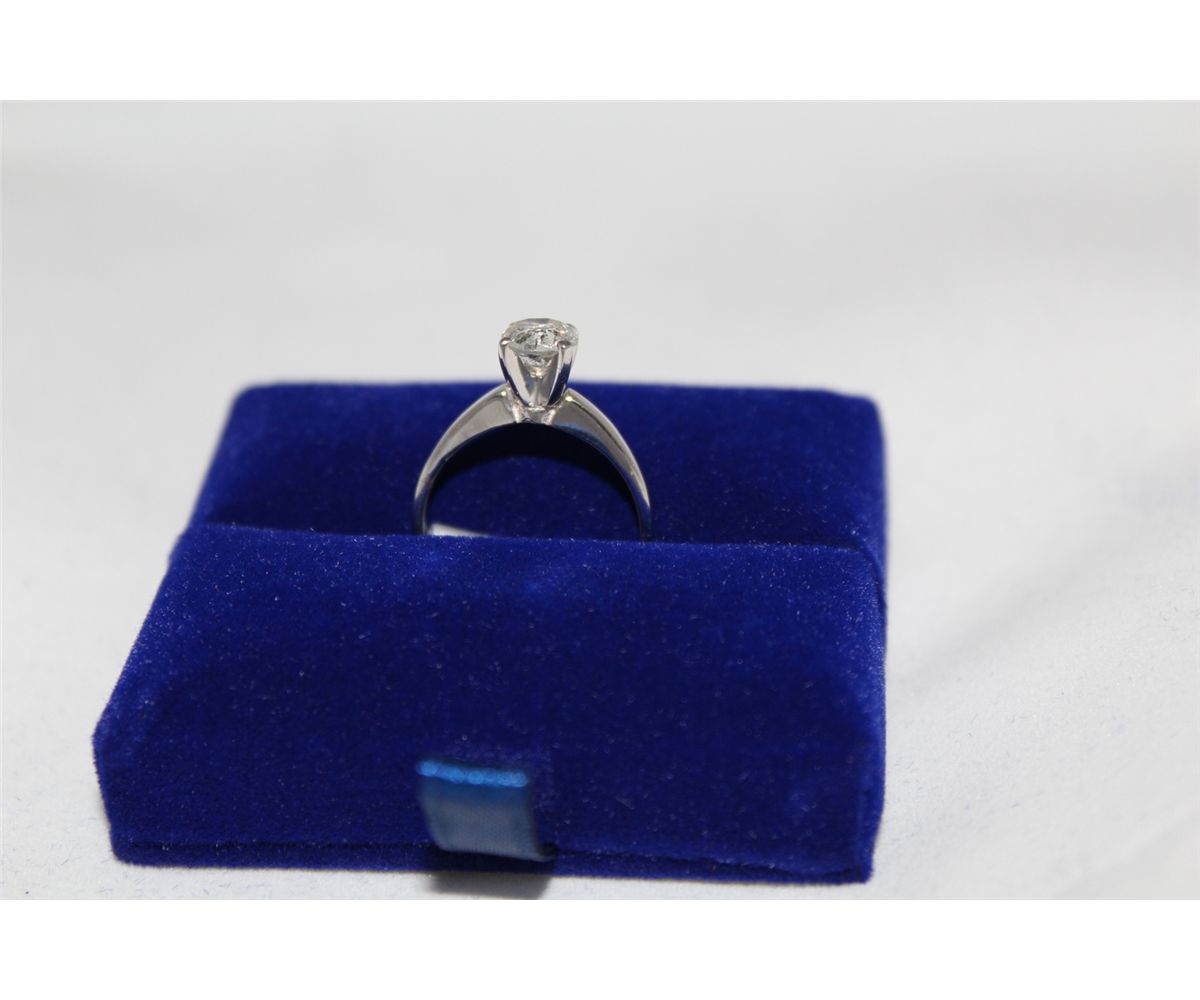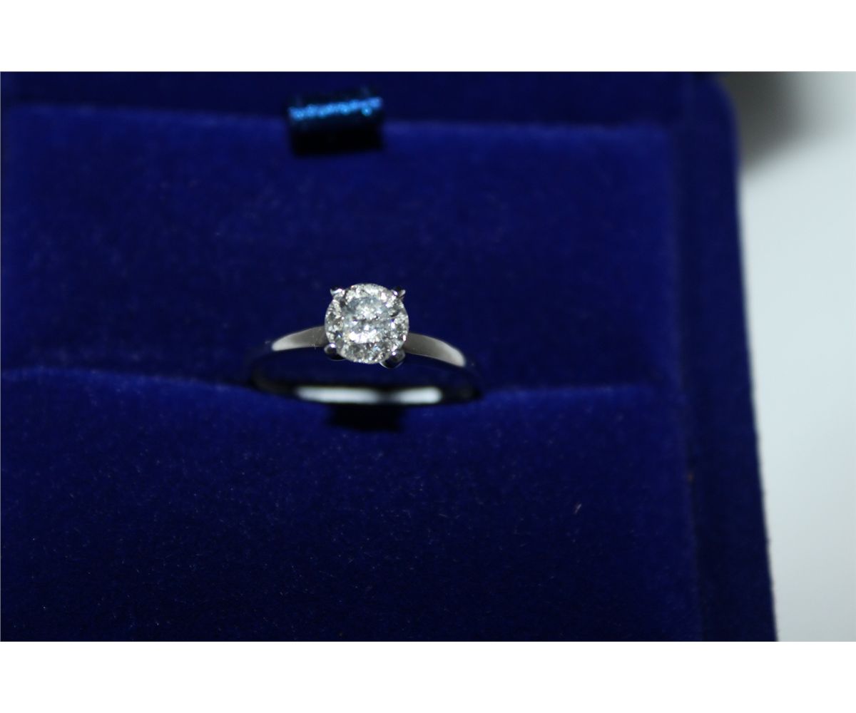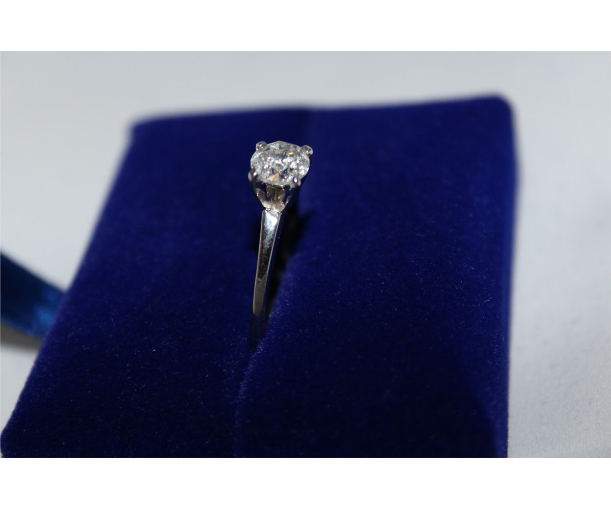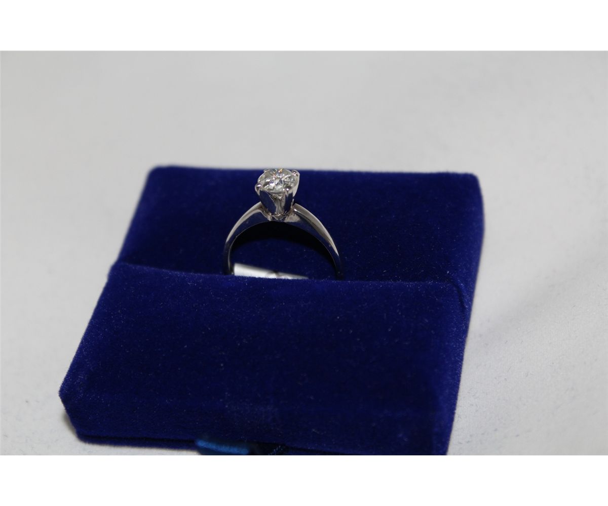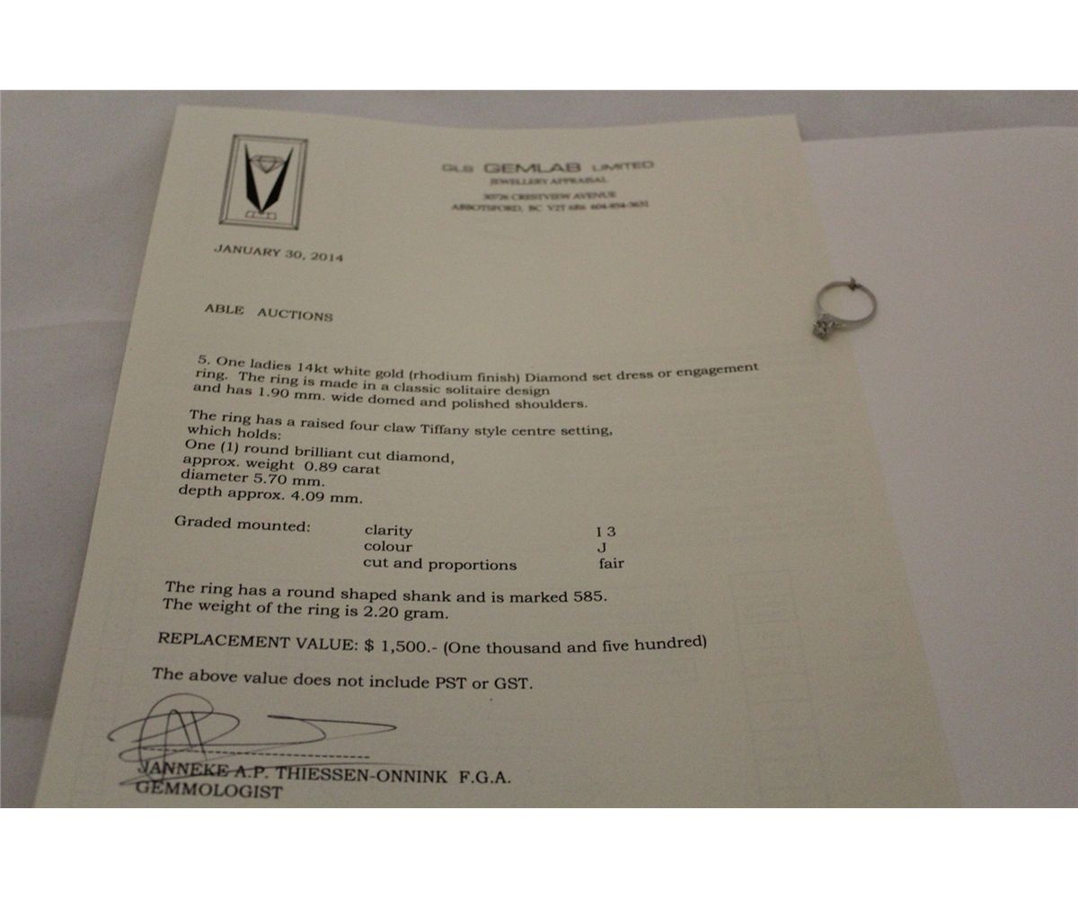 ONE LADIES WHITE GOLD FOUR CLAW DIAMOND RING, STAMPED 14KT. SET WITH ONE (1) ROUND BRILLIANT CUT DIAMOND. APPROX 0.89 CARAT. I-3 CLARITY, J COLOUR, MEDIUM CUT. TOTAL WEIGHT OF THE RING IS 2.2 GRAMS. INCL. GEMOLOGIST APPRAISAL WITH REPLACEMENT VALUE OF $1,500
