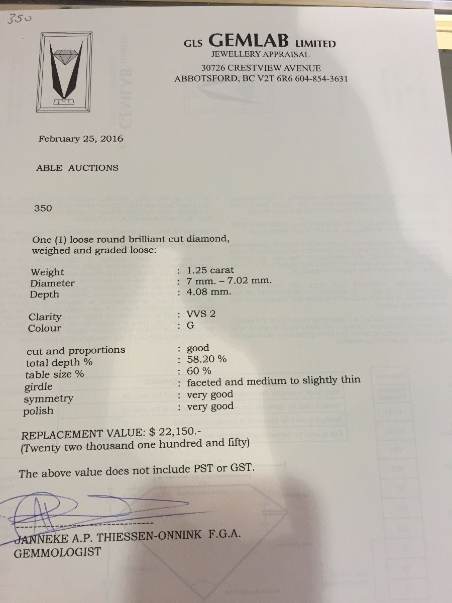 ONE LOOSE ROUND BRILLIANT CUT DIAMOND, WEIGHED AND GRADED LOOSE. 1.25CARAT, VVS 2 CLARITY REPLACEMENT VALUE $22, 150