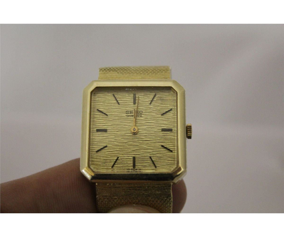 ONE MEN'S 14KT YELLOW GOLD SEIKO DESS STYLE WRIST WATCH. THE WATCH HAS A SQUARE SHAPED CASE OF 26 X 26 MM WITH A TEXTURED TREE BARK DIAL AND BLACK HOUR NOTATIONS. THE WATCH HAS A QUARTZ MOVEMENT AND ATTACHED IS A 14KT YELLOW GOLD MILLENAISE STYLE BRACELET. THE WATCH HAS A TOTAL WEIGHT OF 53.60 GRAMS AND IS 17CM LONG. INCL. GEMOLOGIST APPRAISAL WITH REPLACEMENT VALUE OF $7,500