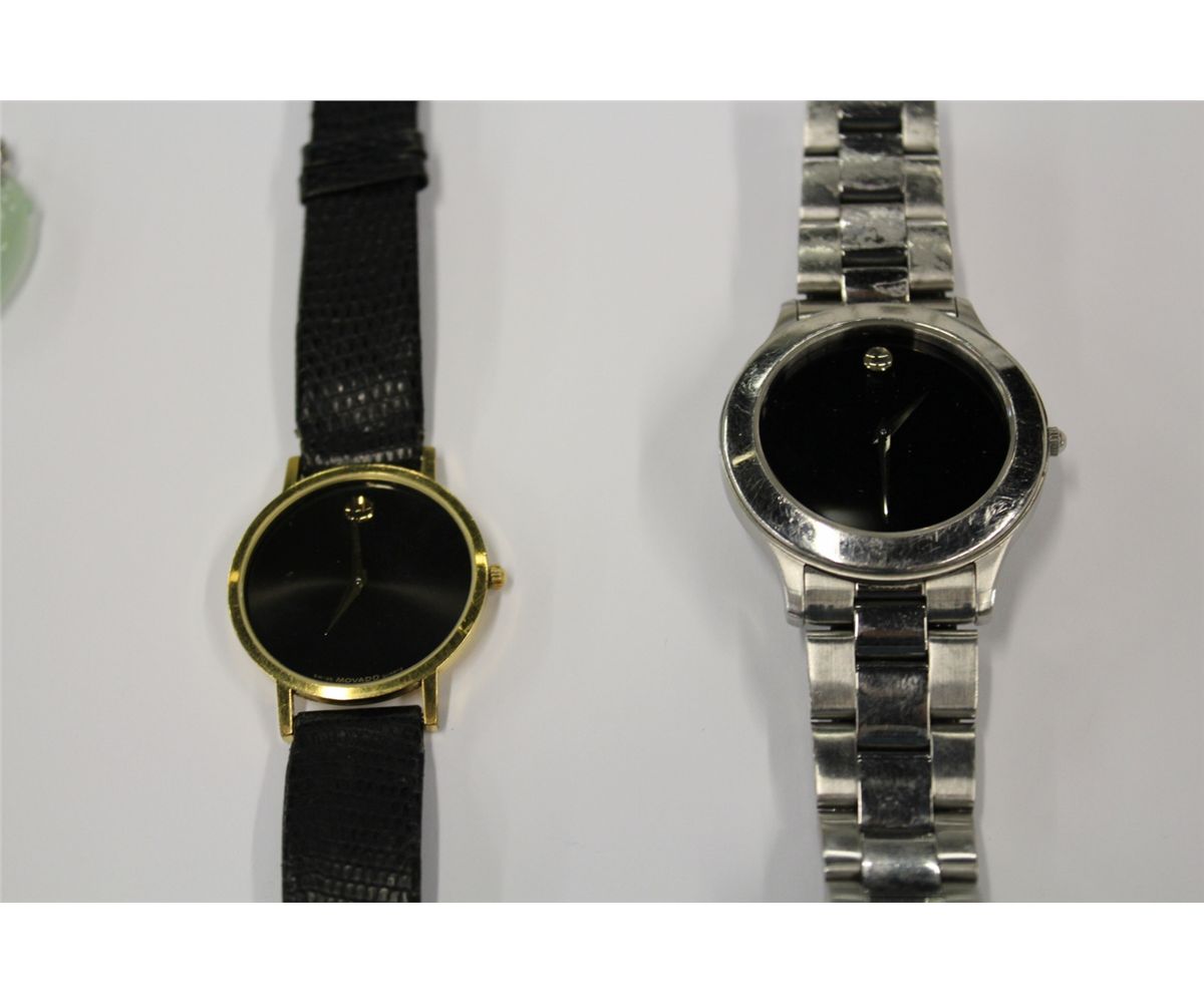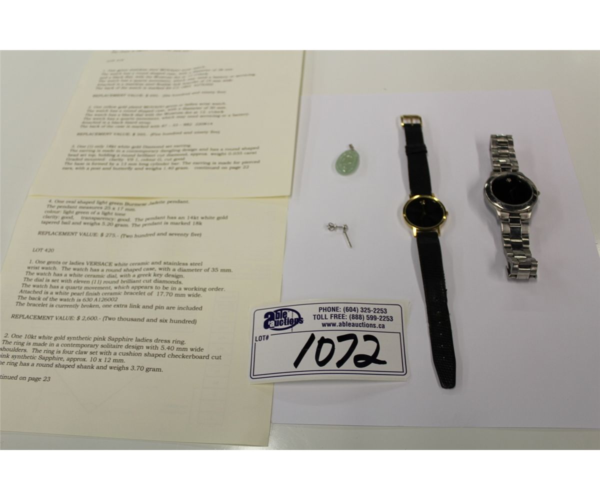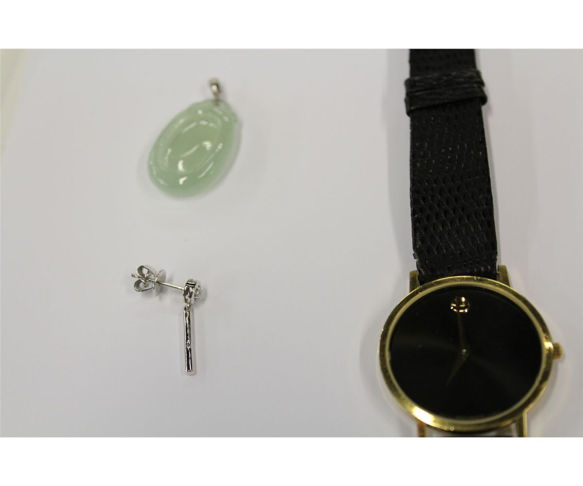 ONE MENS MOVADO WRISTWATCH REPLACEMENT VALUE $695, ONE YELLOW GOLD PLATED MOVADO MENS WATCH REPLACEMENT VALUE $595, ONE  18KT WHITE GOLD DIAMOND SET EARRING, ONE OVAL JADEITE PENDANT REPLACEMENT VALUE $275, INCLUDES PROFESSIONAL APPRAISAL