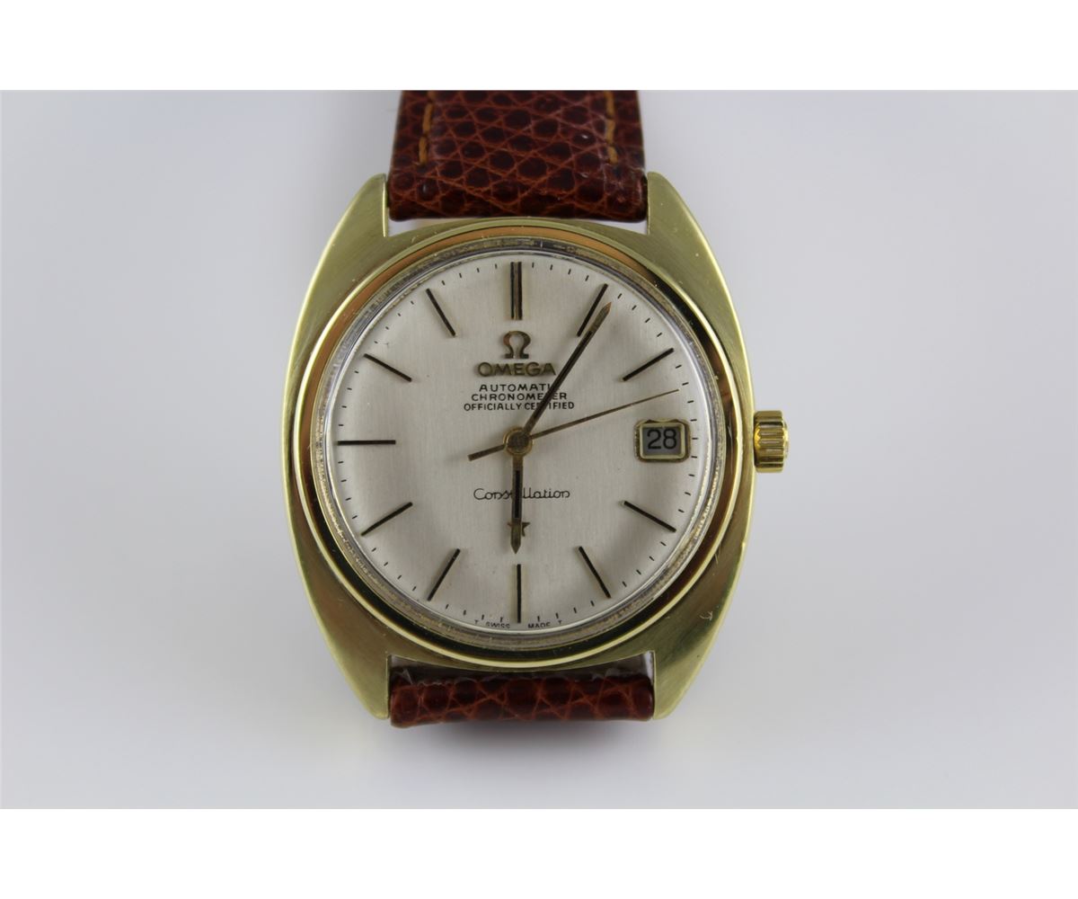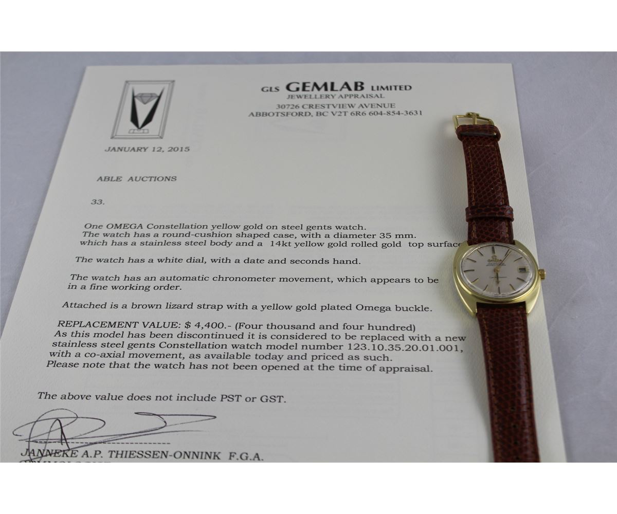 ONE OMEGA CONSTELLATION YELLOW GOLD ON STEEL GENTS WATCH . WATCH HAS AN AUTOMATIC CHRONOMETER MOVEMENT. ATTACHED IS A BROWN LIZARD STRAP WITH A YELLOW GOLD PLATED OMEGA BUCKLE. REPLACEMENT VALUE: $4400.00
