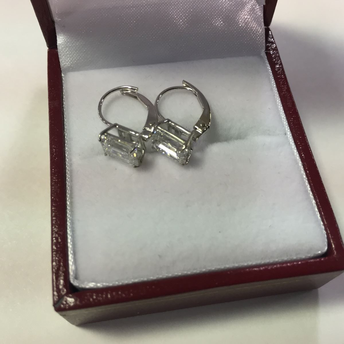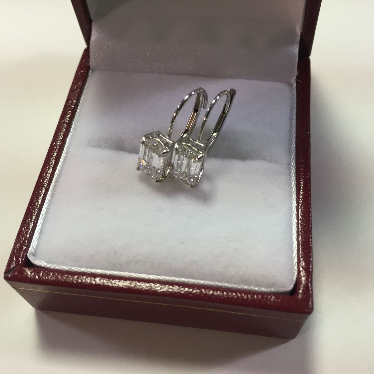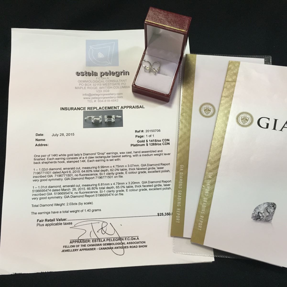 ONE PAIR OF 14KT WHITE GOLD LADIES DIAMOND DROP EARRINGS. SET WITH ONE 1.02CT EMERALD CUT DIAMOND SI-1, E COLOUR WITH GIA REPORT 7196771501 AND ONE 1.01CT EMERALD CUT DIAMOND, SI-1, E COULOUR WITH GIA REPORT 5196695474 GEMMOLOGIST REPLACEMENT VALUE $25,350