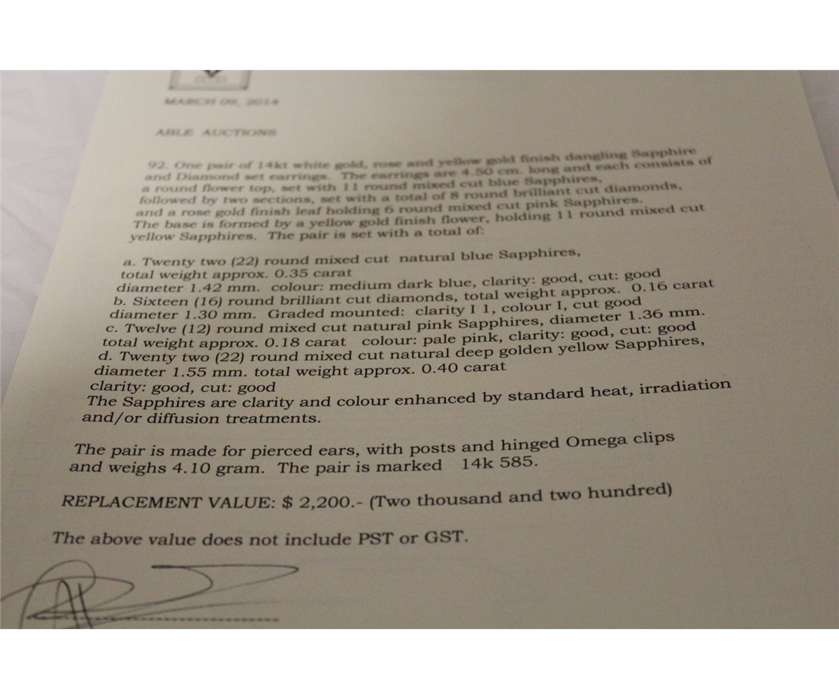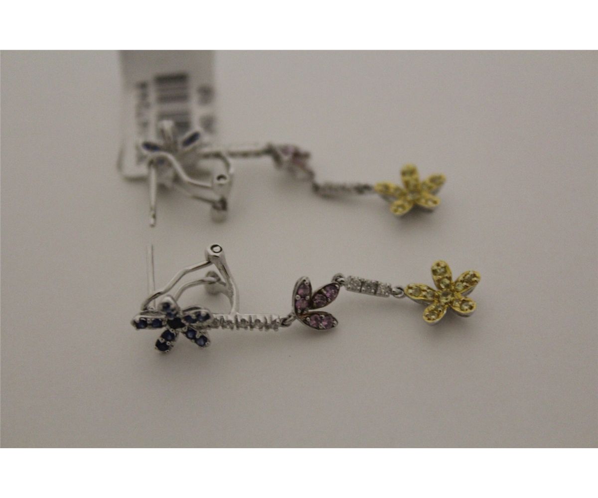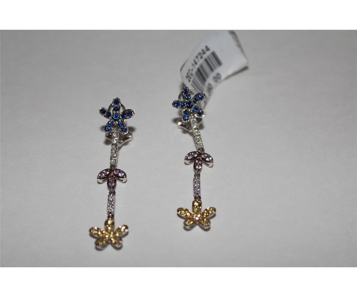 ONE PAIR OF 14KT WHITE GOLD, ROSE AND YELLOW GOLD FINISH DANGLING SAPPHIRE AND DIAMOND SET EARRINGS. 4.50CM LONG. 22 BLUE SAPPHIRES. 16 DIAMONDS, 12 PINK SAPPHIRES, 22 GOLDEN SAPPHIRES. WEIGHS 4.10GRAMS, MARKED 14K 585 REPLACEMENT VALUE $2,200.00