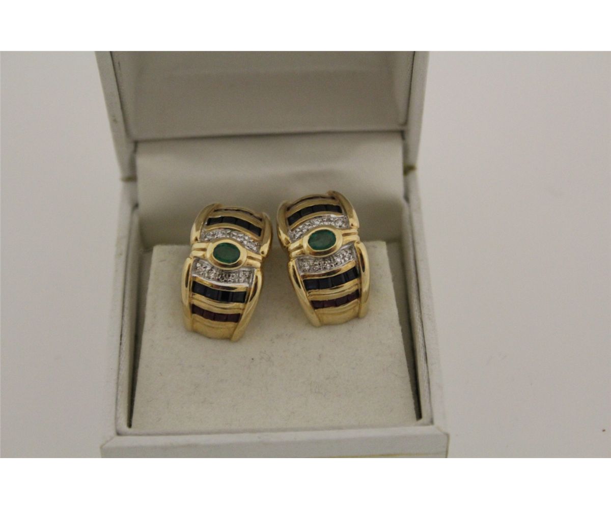 ONE PAIR OF 14KT YELLOW GOLD AND RHODIUM FINISH NATURAL EMERALD, DIAMOND, BLUE SAPPHIRE AND RUBY EARRINGS. FEATURING AN OVAL MIXED CUT BEZEL SET NATURAL EMERALD, FLANKED BY 5 SINGLE CUT DIAMONDS, 4 SQUARE CUT NATURAL RUBIES. 12.2 GRAM WITH GEMMOLOGIST APPRAISAL OF $2,950