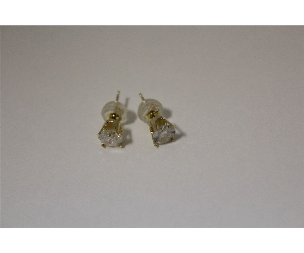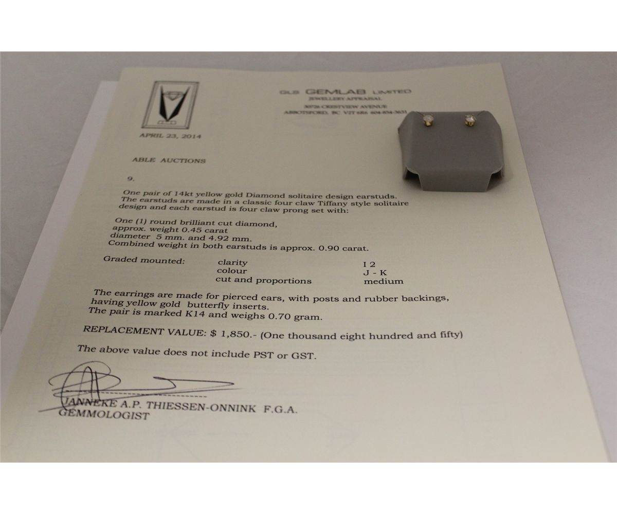 ONE PAIR OF 14KT YELLOW GOLD DIAMOND SOLITAIRE DESIGN EARSTUDS. COMBINED WEIGHT OF BOTH STUDS IS 0.90 CARAT. I2, J-K COLOUR, MEDIUM CUT. MADE FOR PIERECED EARS WITH POSTS AND RUBBER BACKING.INCL. GEMMOLOGIST APPRAISAL OF $1850