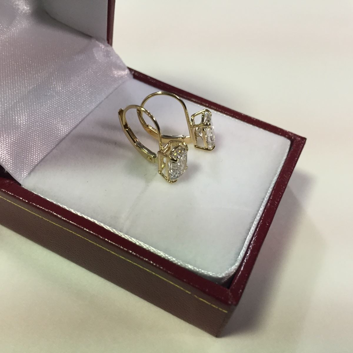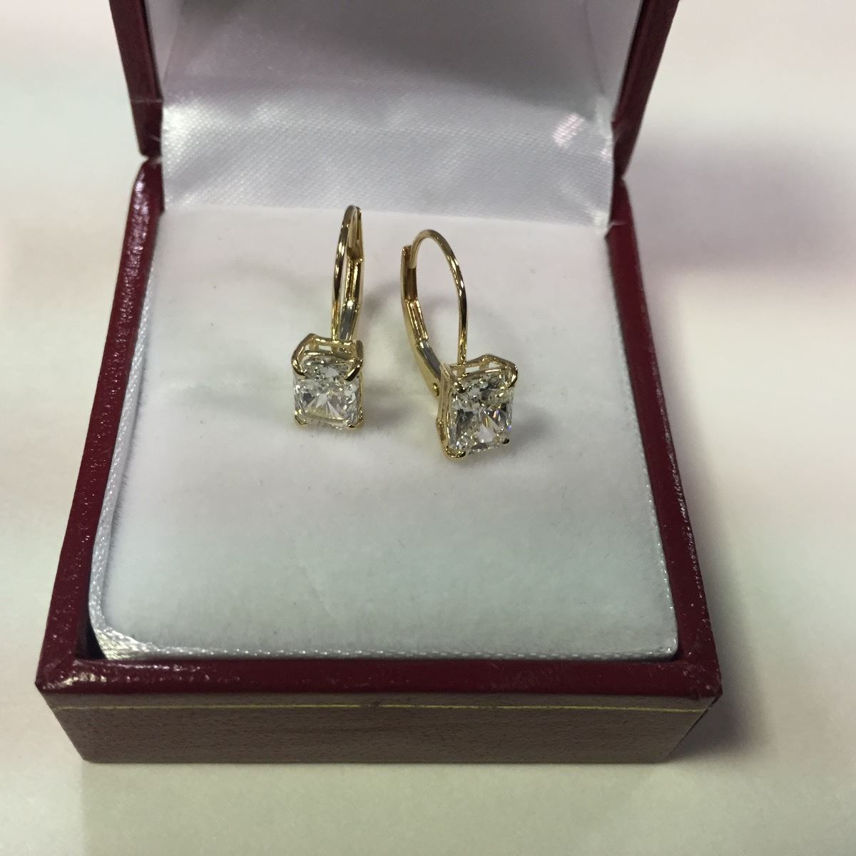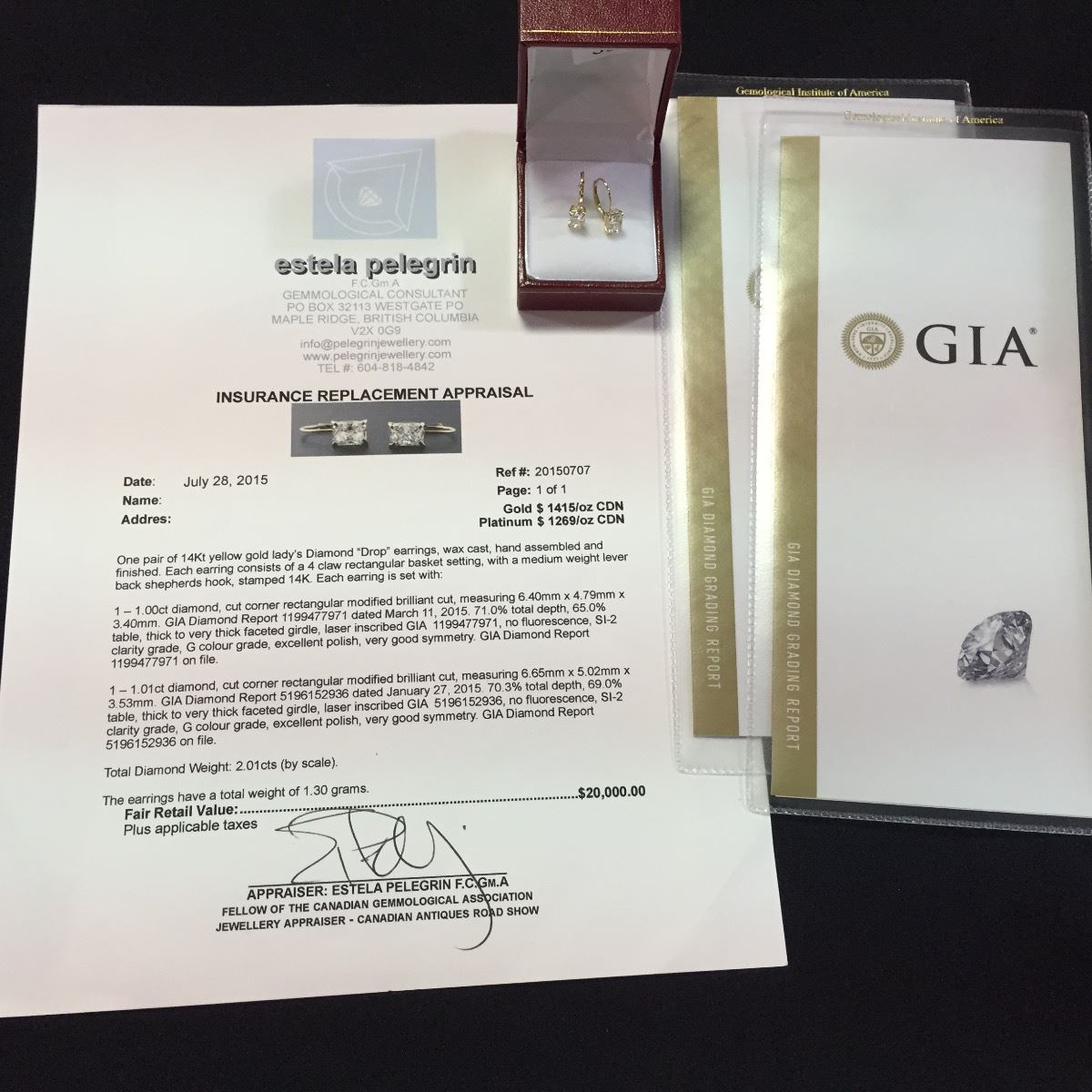 ONE PAIR OF 14KT YELLOW GOLD LADIES DIAMOND DROP EARRINGS. SET WITH ONE 1.00CT RECTANGULAR MODIFIED BRILLIANT CUT DIAMOND, SI-2, G COLOUR WITH GIA REPORT AND ONE 1.01CT MODIFIED BRILLIANT CUT SI-2 G COLOUR GEMMOLOGIST REPLACEMENT VALUE $20,000