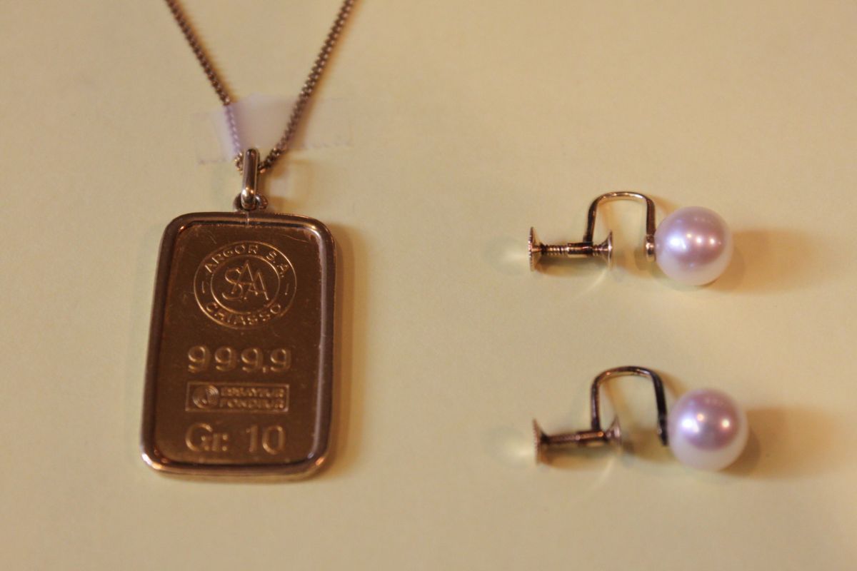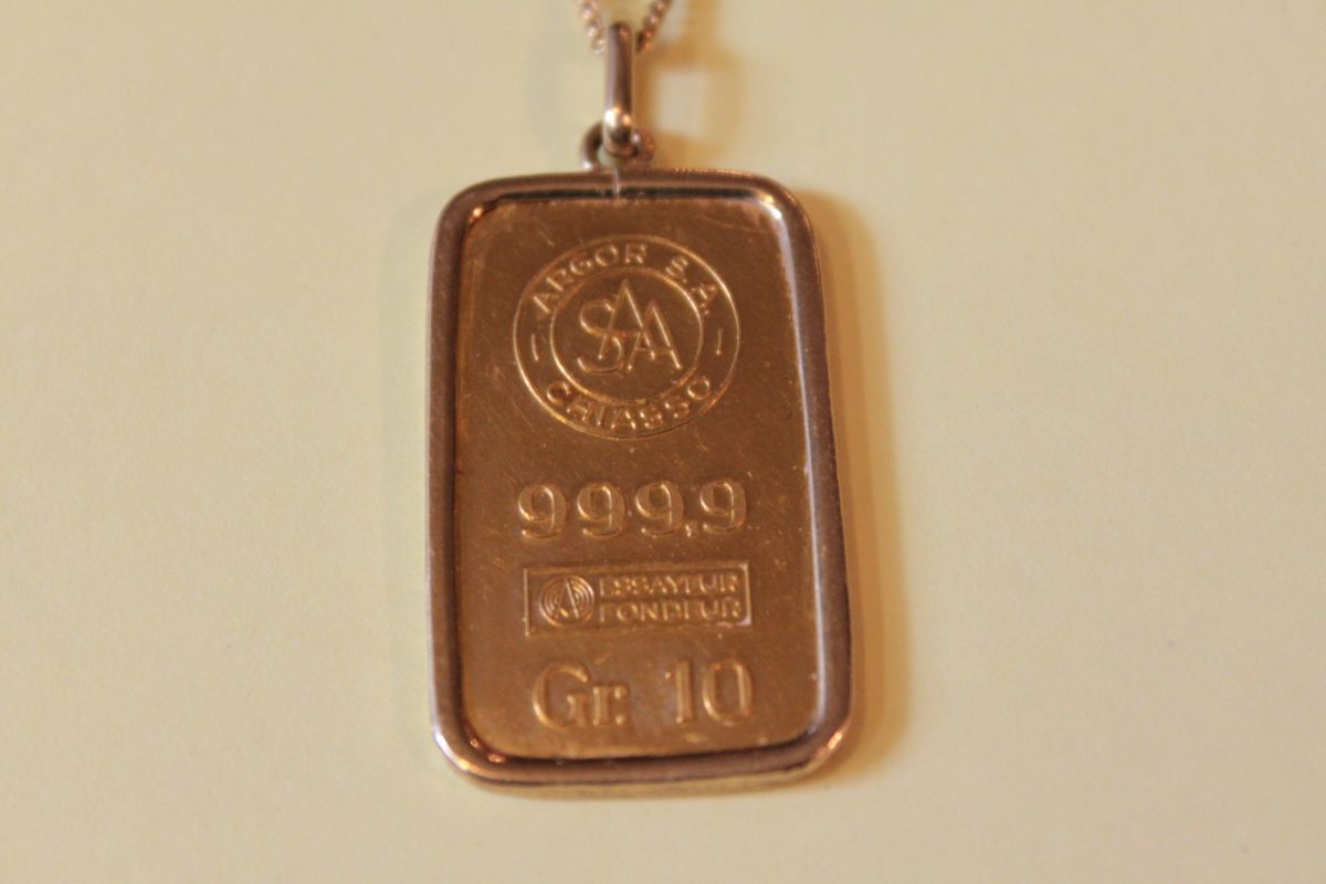Consisting of a 10 gram 24kt (999.9) fine gold ingot, mounted in an 18kt yellow gold flat profile bezel style frame.  The pendant has an oval shaped jumpring top