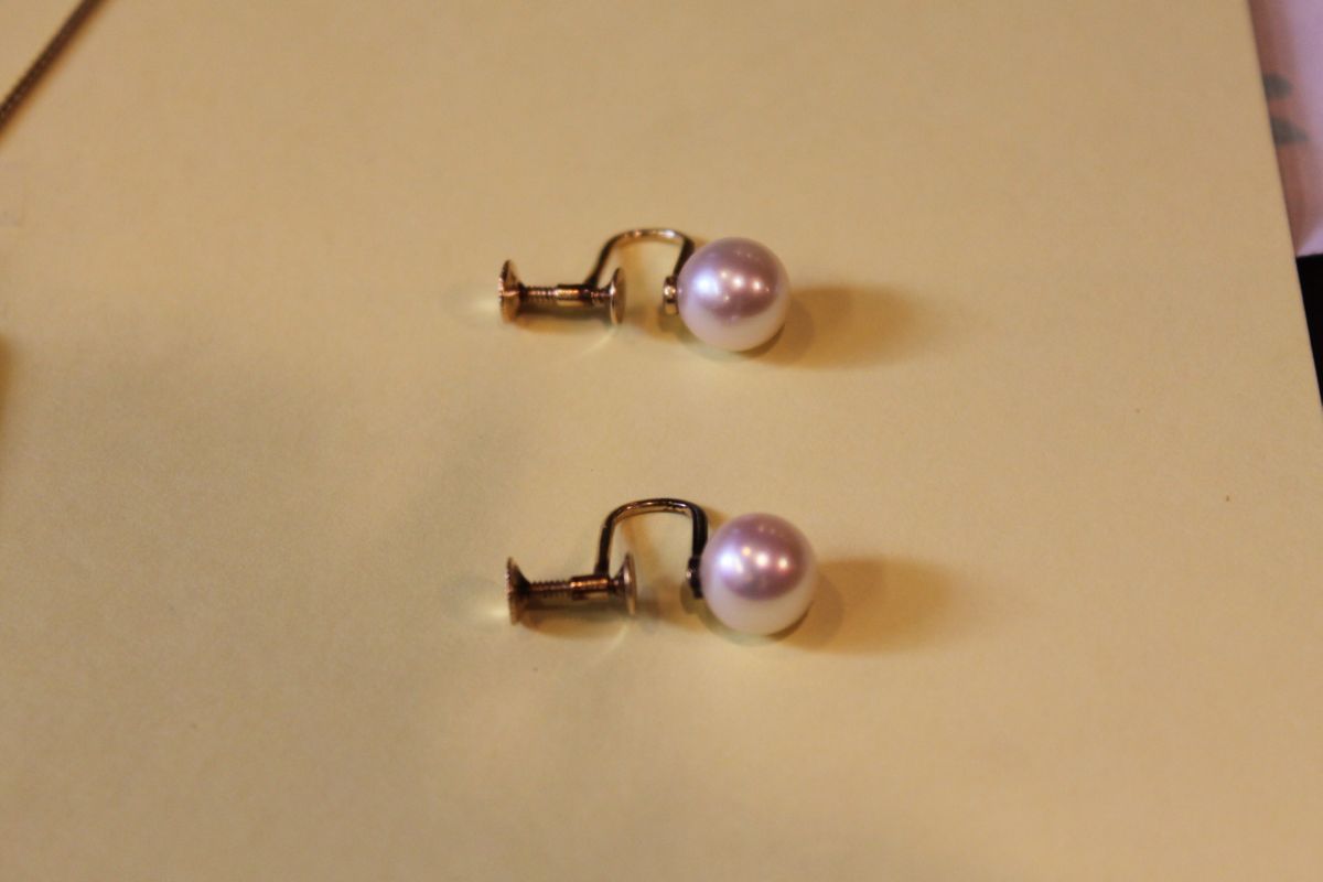 One pair of 14kt yellow gold Mikimoto white cultured pearl earrings.