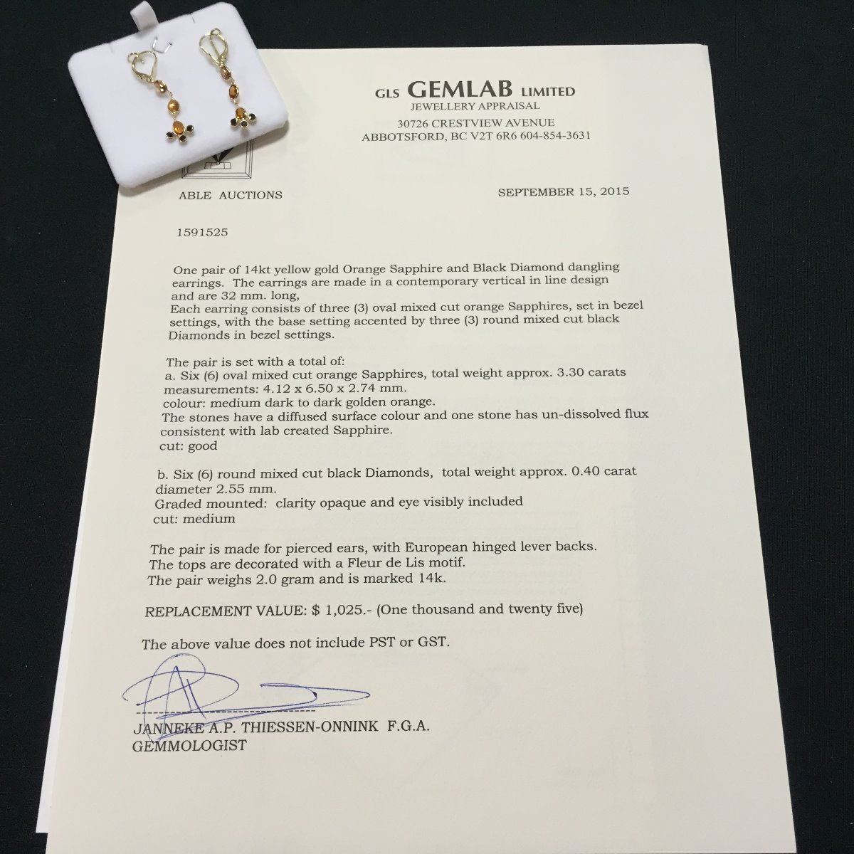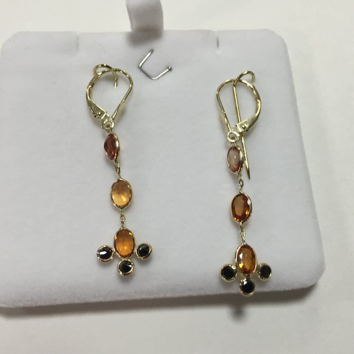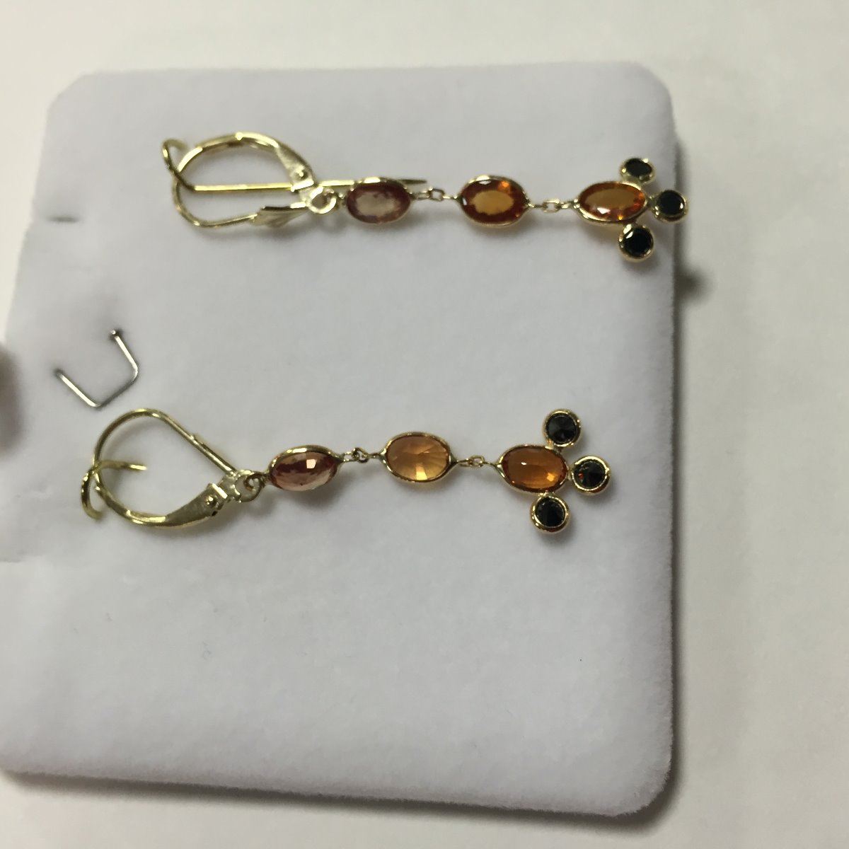 ONE PAIR OF 14KT YELLOW GOLD ORANGE SAPPHIRE AND BLACK DIAMOND DANGLING EARRINGS WITH A TOTAL OF 6 SAPPHIRES, APPROX 3.30CARATS AND 6 BLACK DIAMONDS, APPROX 0.40CARAT REPLACEMENT VALUE $1025
