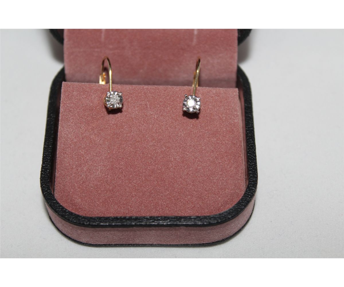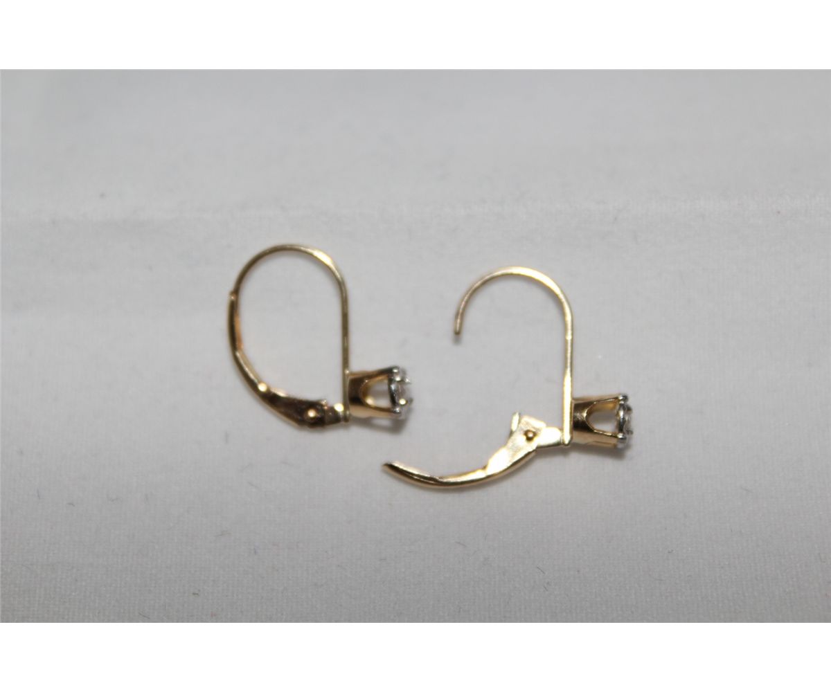ONE PAIR OF 14KT YELLOW-WHITE GOLD LADIES DROP STYLE DIAMOND EARRINGS. STAMPED 14K, SET WITH TWO ROUND BRILLIANT CUT DIAMONDS. APPROX 0.085 CARATS. CLARITY: I-1 COLOUR: I SPECIAL "SHEPHERD-HOOK" BACKINGS INCL. GEMOLOGIST APPRAISAL
