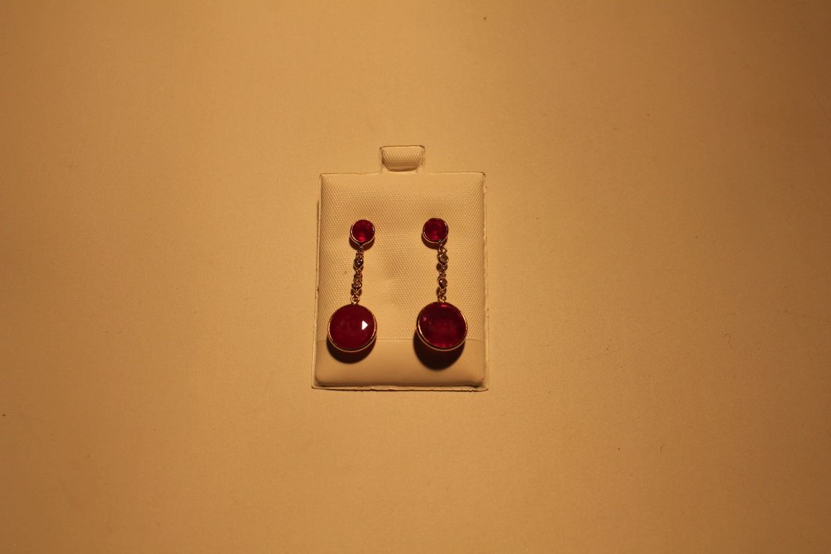 ONE PAIR OF HAND FASHIONED CUSTOM DESIGNED DROP STYLE YELLOW GOLD BEZEL SET RUBY STONE AND DIAMOND EARRINGS 14KT SET WITH, 4 ROUND SHAPE NATURAL RUBIES, 5.2MM-10MM, APPRO WEIGHT 10.70CARATS, MEDIUM INTENSE PINKISH REDDISH COLOUR, 4 BRILLANT DIAMONDS 2.1MM, 0.15 CARATS SI CLARITY J