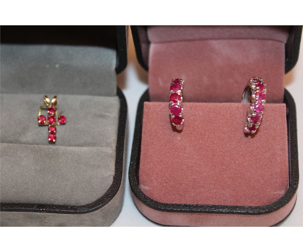ONE PAIR OF LADIES STERLING SILVER HALF HOOP RUBY EARRINGS SET WITH TWELVE (12) ROUND SHAPE NATURAL RUBIES. 1.20 CARATS AND ONE 10KT YELLOW GOLD RUBY CROSS STYLE PENDANT SET WITH SIX (6) ROUND NATURAL RUBIES 0.26 CARATS INCL. DIAMOND GRADER APPRAISAL