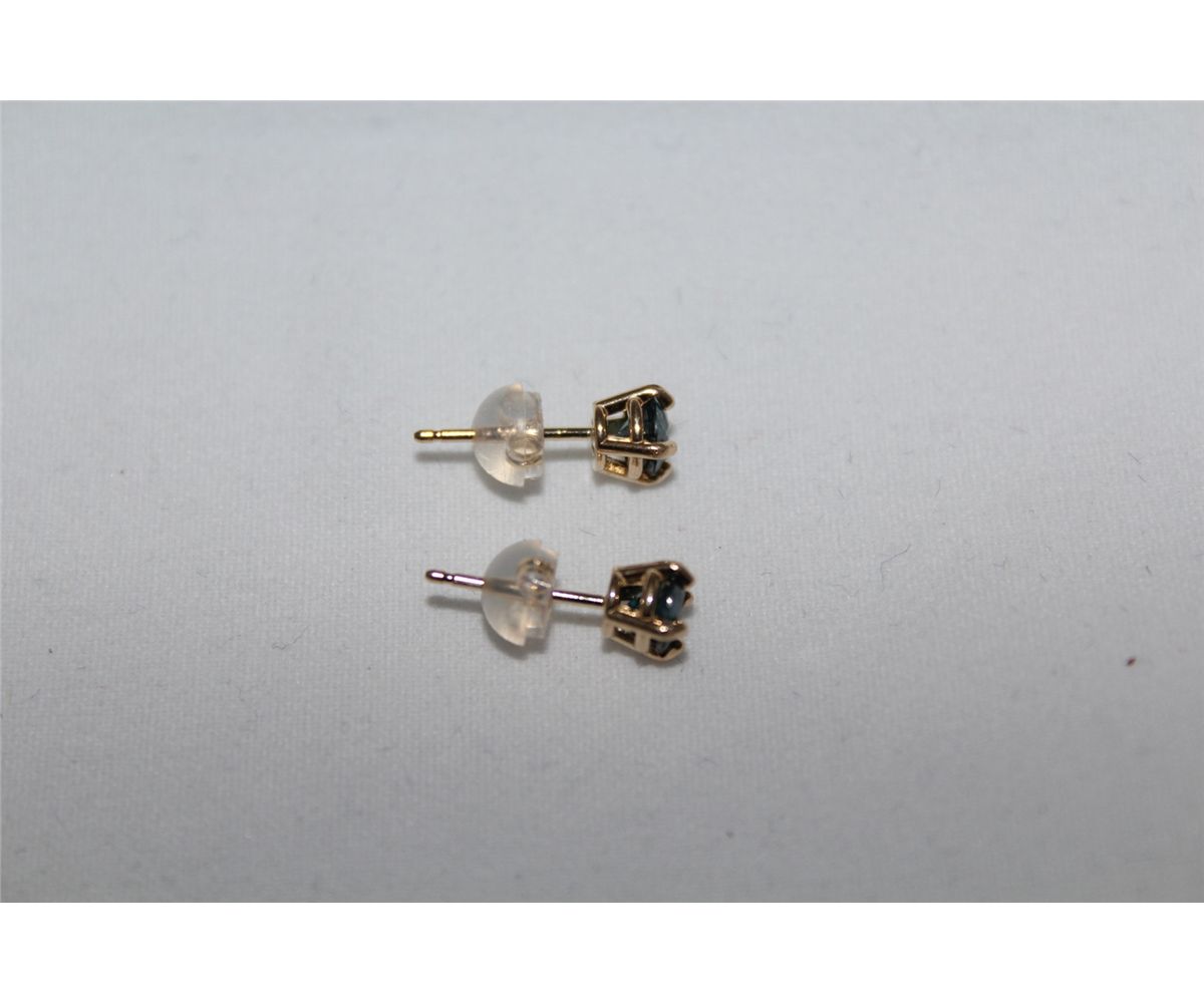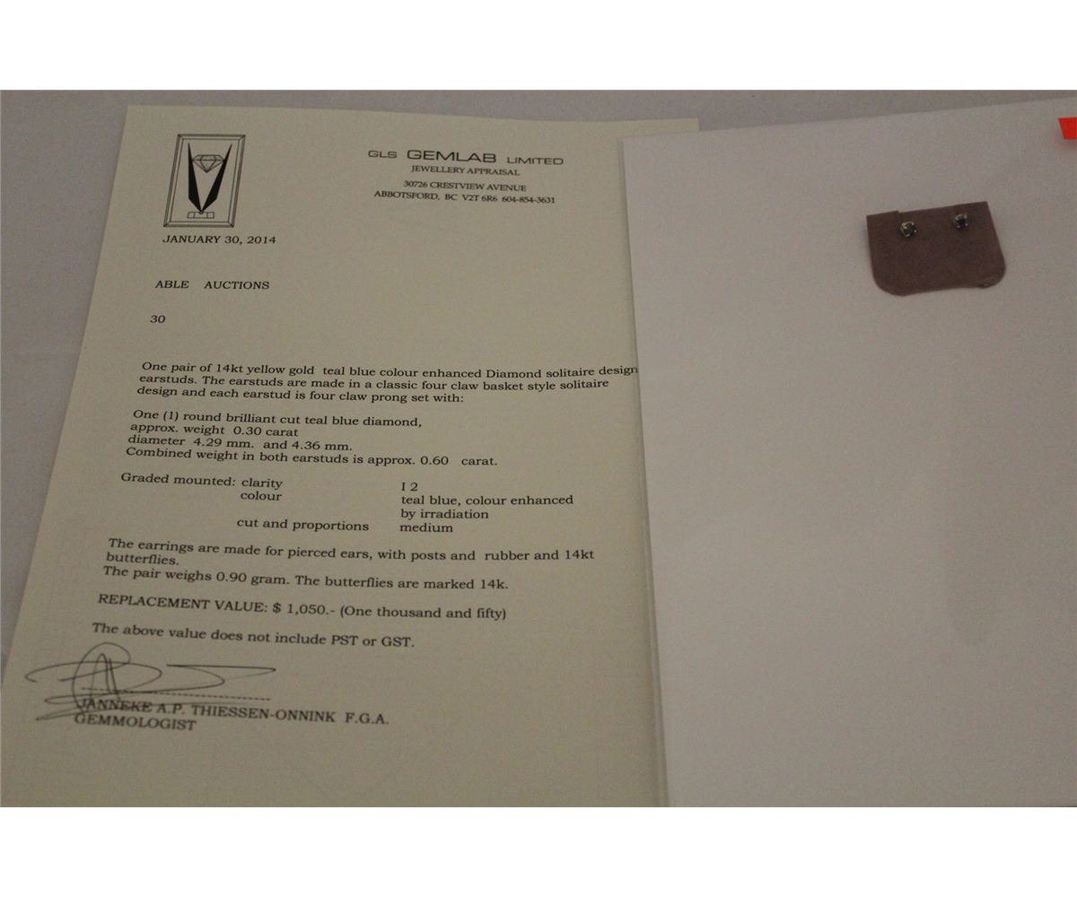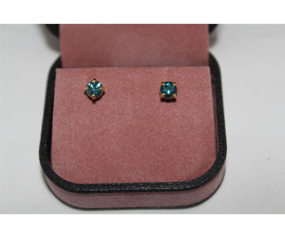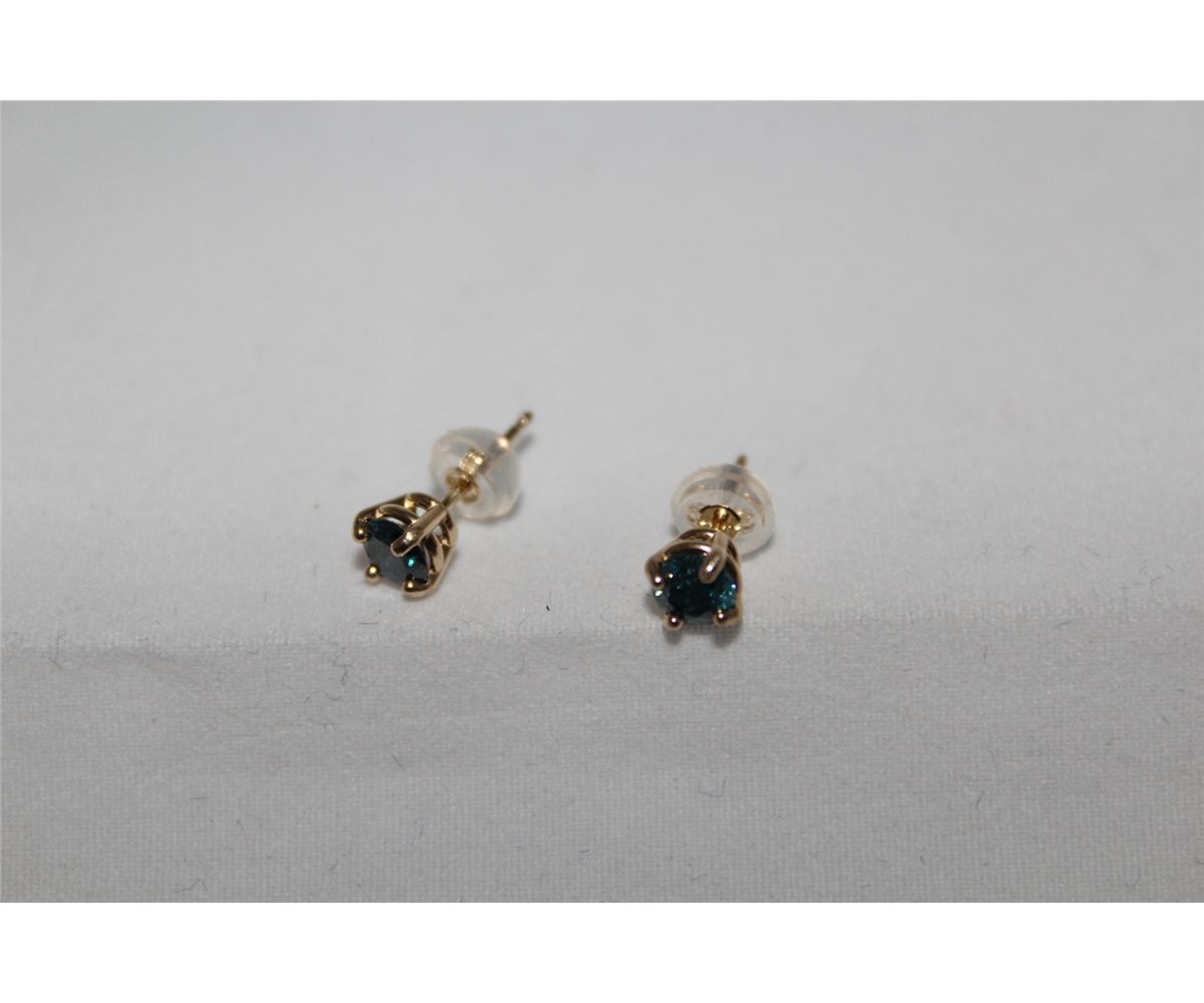 ONE PAIR OF YELLOW GOLD BLUE COLOURED DIAMOND STUD EARRINGS, STAMPED 14KT. SET WITH TWO (2) ROUND BRILLIANT CUT DIAMONDS, APPROX 0.70 CARATS. CLARITY: SI-2-I-1 COLOUR: BLUE CUT: MED-GOOD INCL. GEMOLOGIST APPRAISAL WITH REPLACEMENT VALUE OF $1,050