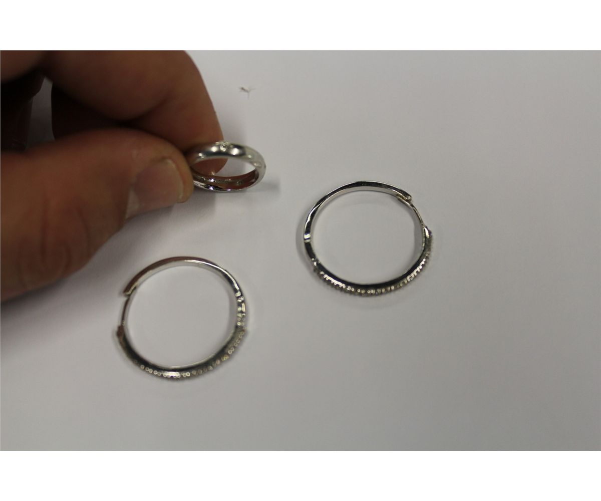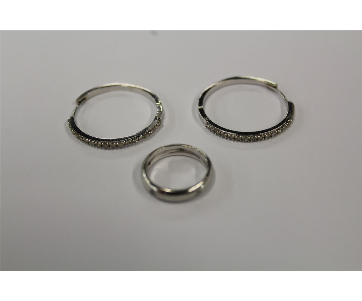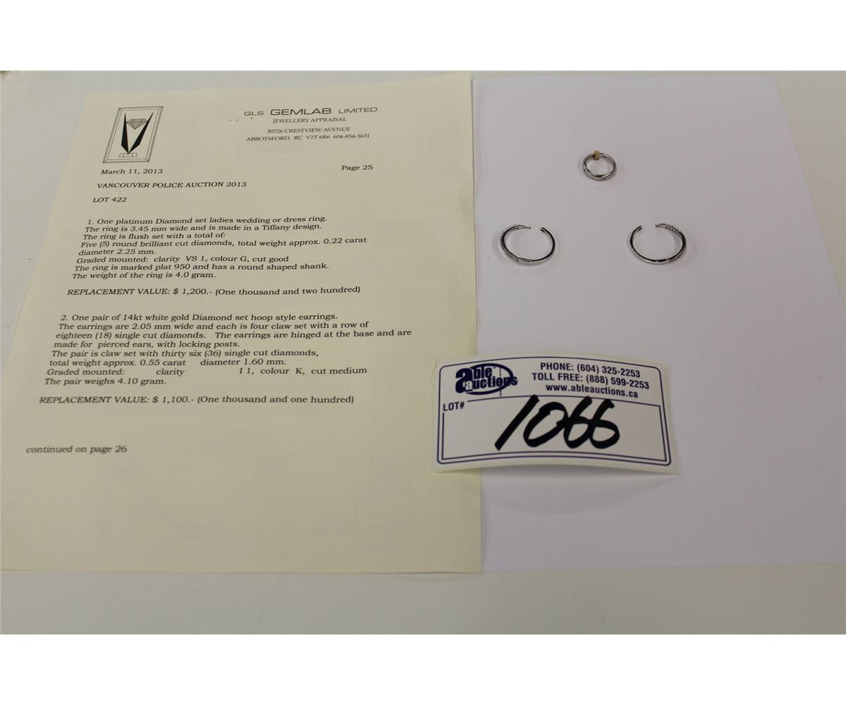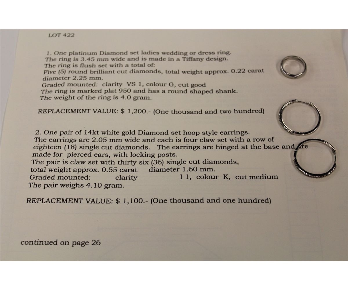 ONE PLATINUM DIAMOND SET LADIES WEDDING OR DRESS RING- REPLACEMENT VALUE $1200 AND ONE PAIR OF 14KT WHITE GOLD DIAMOND SET HOOP STYLE EARRINGS REPLACEMENT VALUE $1100