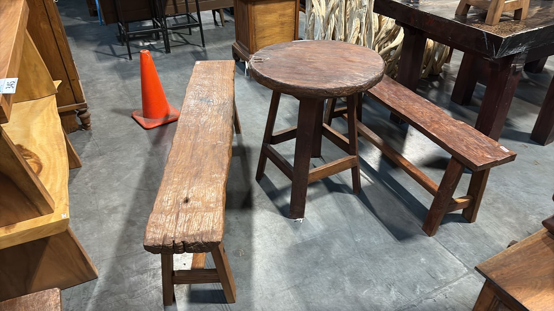 ONE RECLAIMED WOOD TABLE 24"D AND 2 SMALL BENCHES