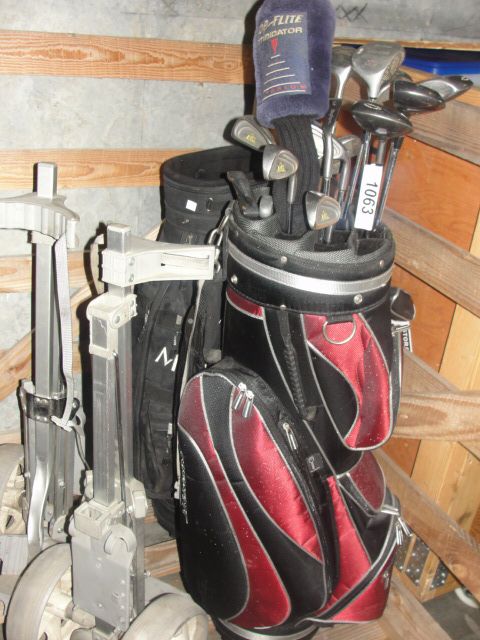 ONE RIGHT HANDED GOLF CLUB SET WITH 2 BAGS AND 2 GOLF BAG CARTS