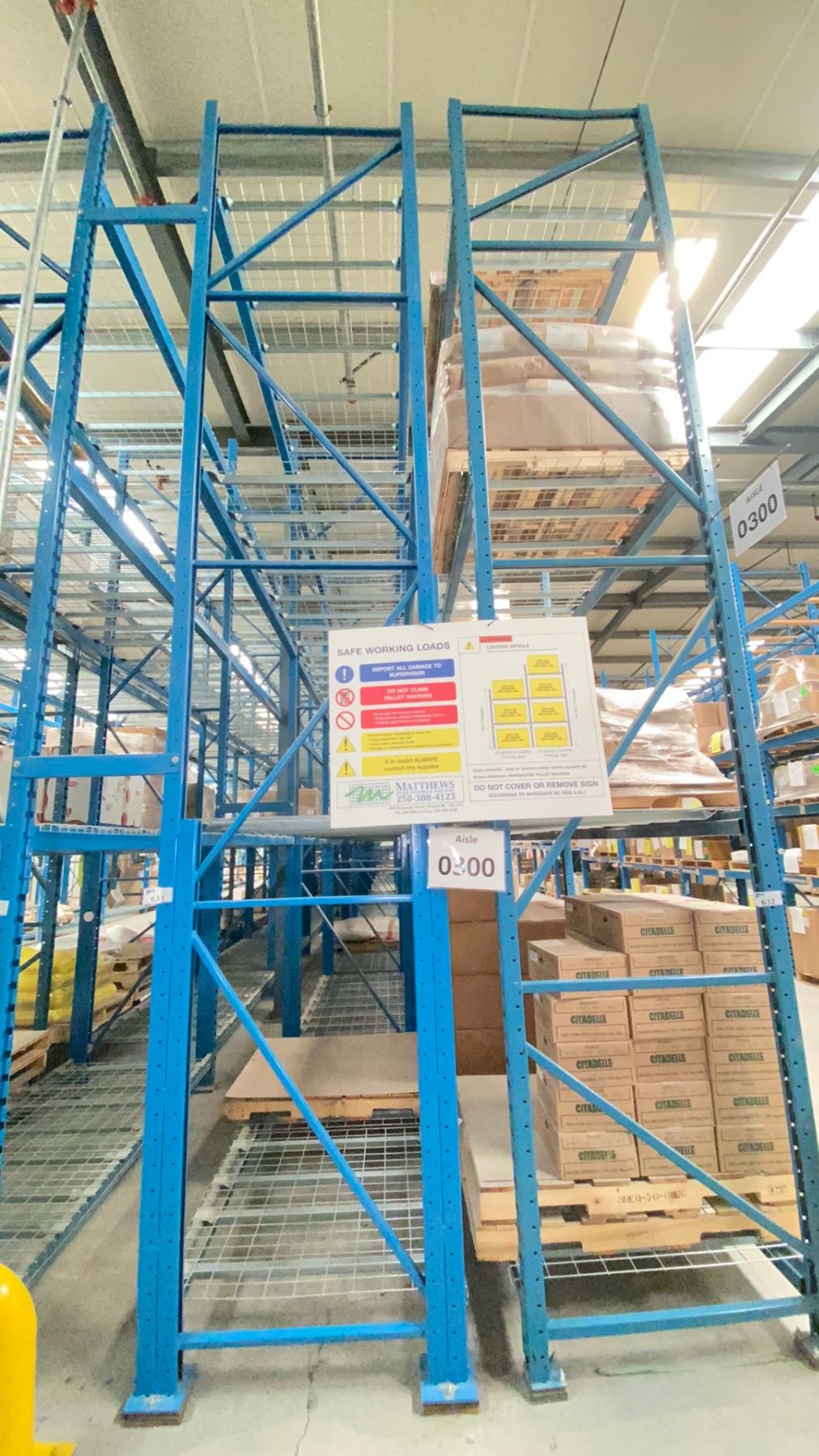 ONE ROW OF RACKING. 42" DEEP. 10 X 18' HIGH FRAMES, 7 X 12' HIGH FRAMES, 114 X 8' BEAMS. 110 X 4' SECTIONS WIRE DECKING. NO CONTENTS. *DISMANTLING AND REMOVAL OF ALL RACKING WILL BE SCHEDULED AFTER THE AUCTION WITH THE BUYERS; REMOVAL PROCESS TO START JUNE 15*