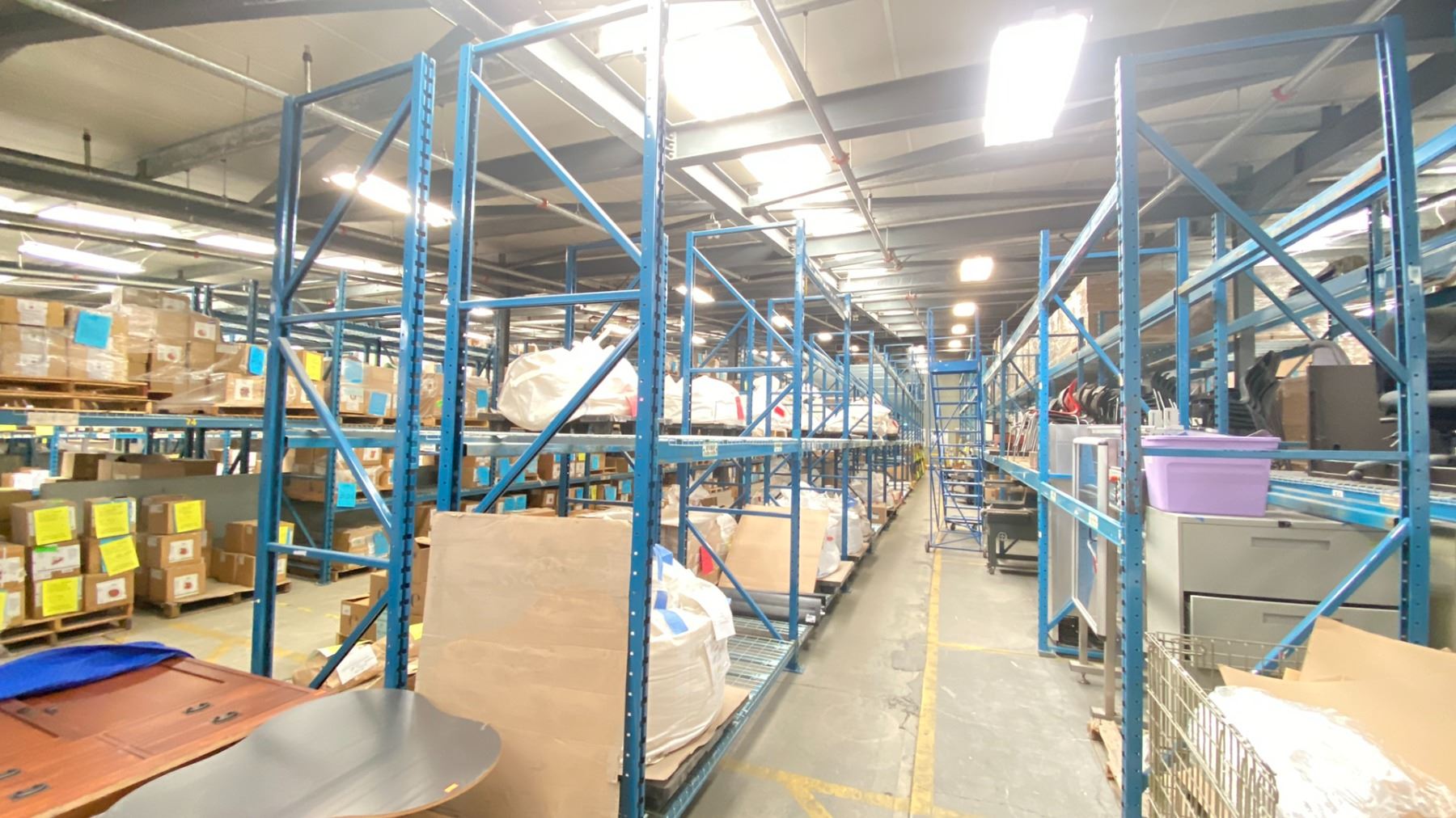 ONE ROW OF RACKING. 42" DEEP. 5 X 18' HIGH FRAMES, 8 X 12' HIGH FRAMES, 76 X 8' BEAMS. 72 X 4' SECTIONS WIRE DECKING. NO CONTENTS. *DISMANTLING AND REMOVAL OF ALL RACKING WILL BE SCHEDULED AFTER THE AUCTION WITH THE BUYERS; REMOVAL PROCESS TO START JUNE 15*