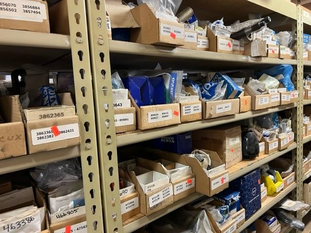 ONE SIDE CONTENTS OF 5 SHELVES. LOOKS TO BE ALL VOLVO PENTA PARTS. BELTS, THERMOSTATS, GASKETS, HOSES, WASHERS, SEALS, SEAL RINGS, GEARS, REBUILT KITS, CABLES, BELT SETS, GAUGES, RINGS SETS, SHIMS, WEAR WASHERS, DIST CAP, SPRINGS, SCREWS, STEERINGS CYLINDERS, PUMPS, DRIVES, VOLVO CAMSHAFT AND MUCH MORE