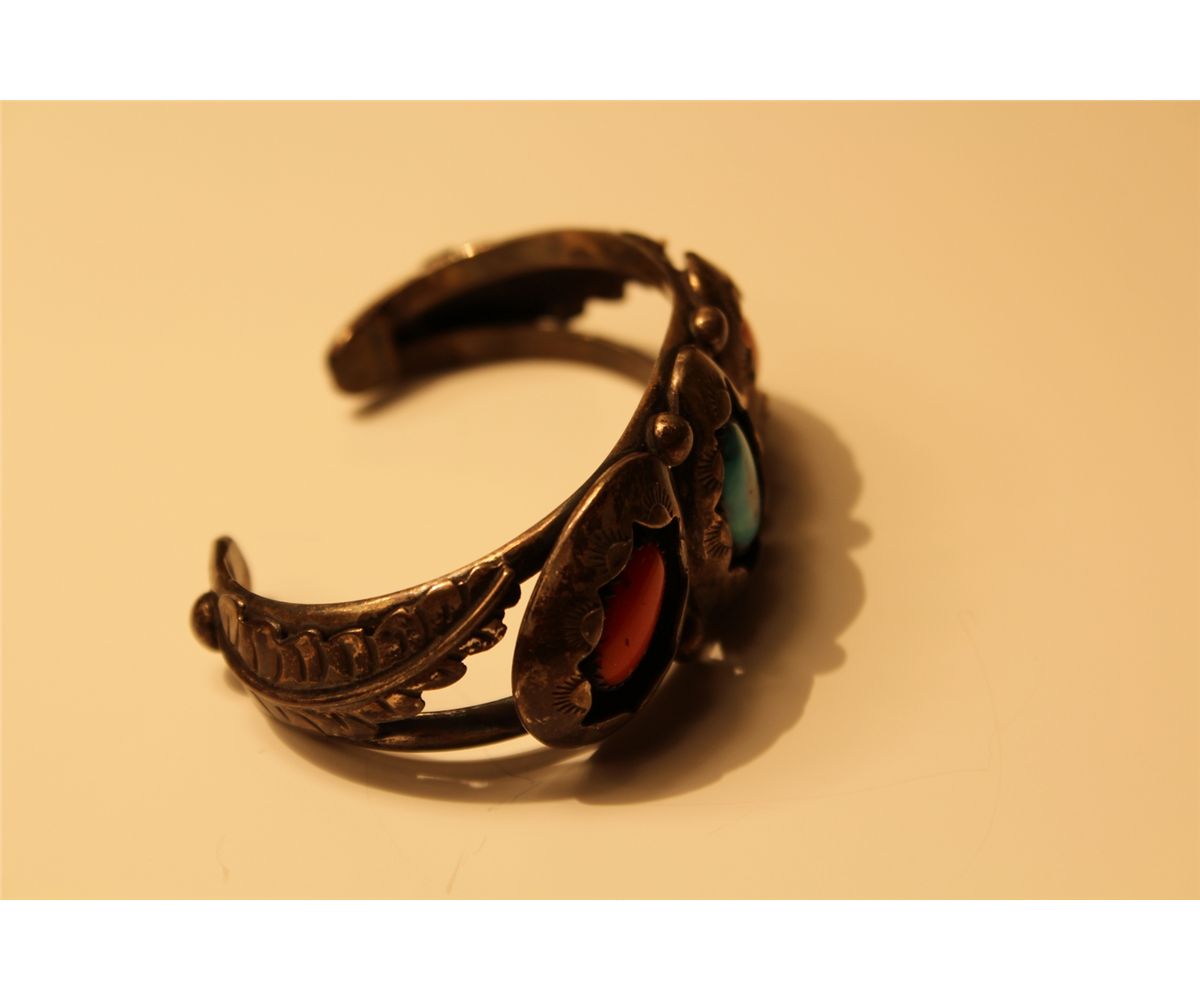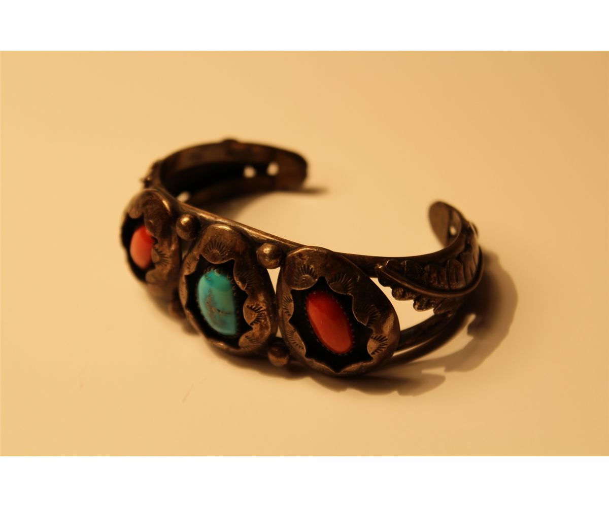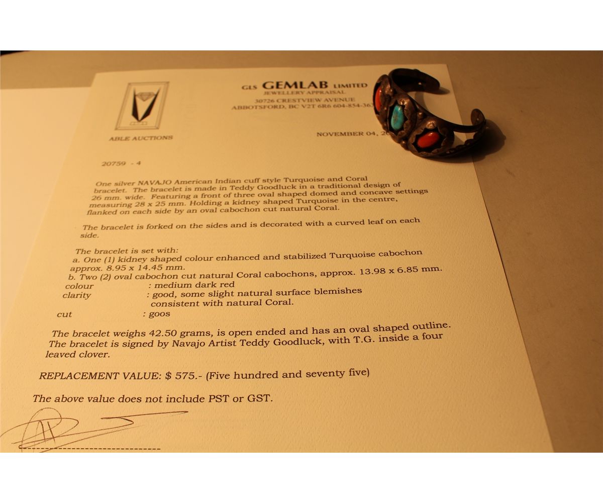 ONE SILVER NAVAJO AMERICAN INDIAN CUFF STYLE TURQUOISE AND CORAL BRACELET. SIGNED BY NAVAJO ARTIST TEDDY GOODLUCK AND WEIGHS 42.5 GRAMS REPLACEMENT VALUE OF $575