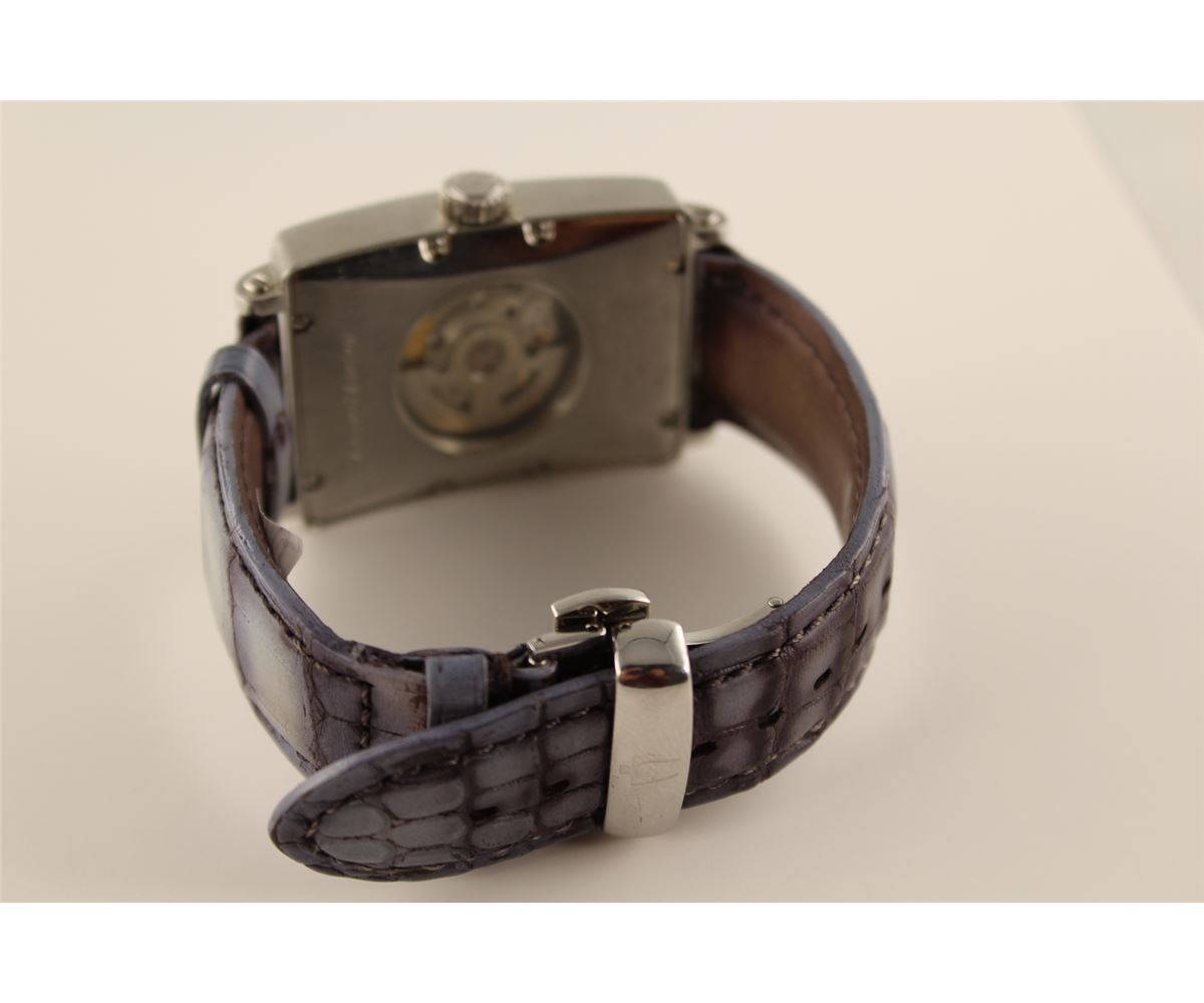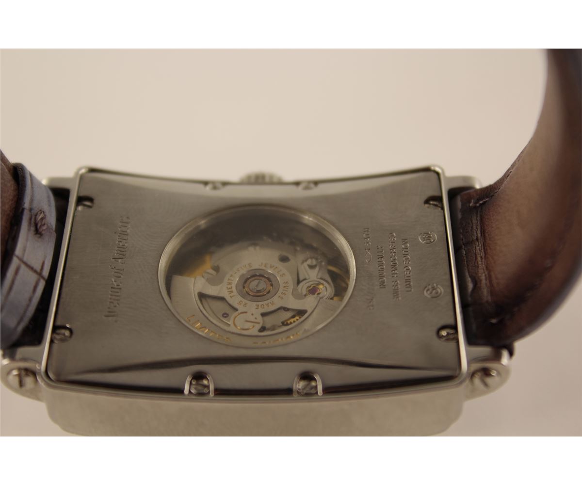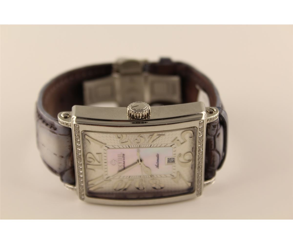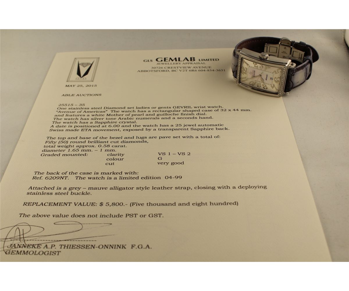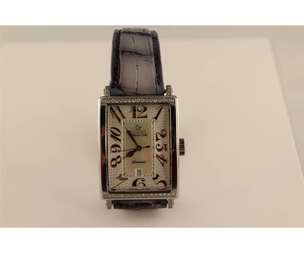 ONE STAINLESS STEEL DIAMOND SET LADIES OR GENTS GEVRIL "AVENUE OF AMERICAS" WRIST WATCH. FEATURING MOTHER OF PEARL AND GUILLOCHE FINISHED DIAL, THE WATCH HAS A 25 JEWEL AUTOMATIC SWISS ETA MOVEMENT, WITH TRANSPARENT SAPPHIRE BACK. ALSO 50 DIAOMONDS 0.58CT REPLACEMENT VALUE $5800