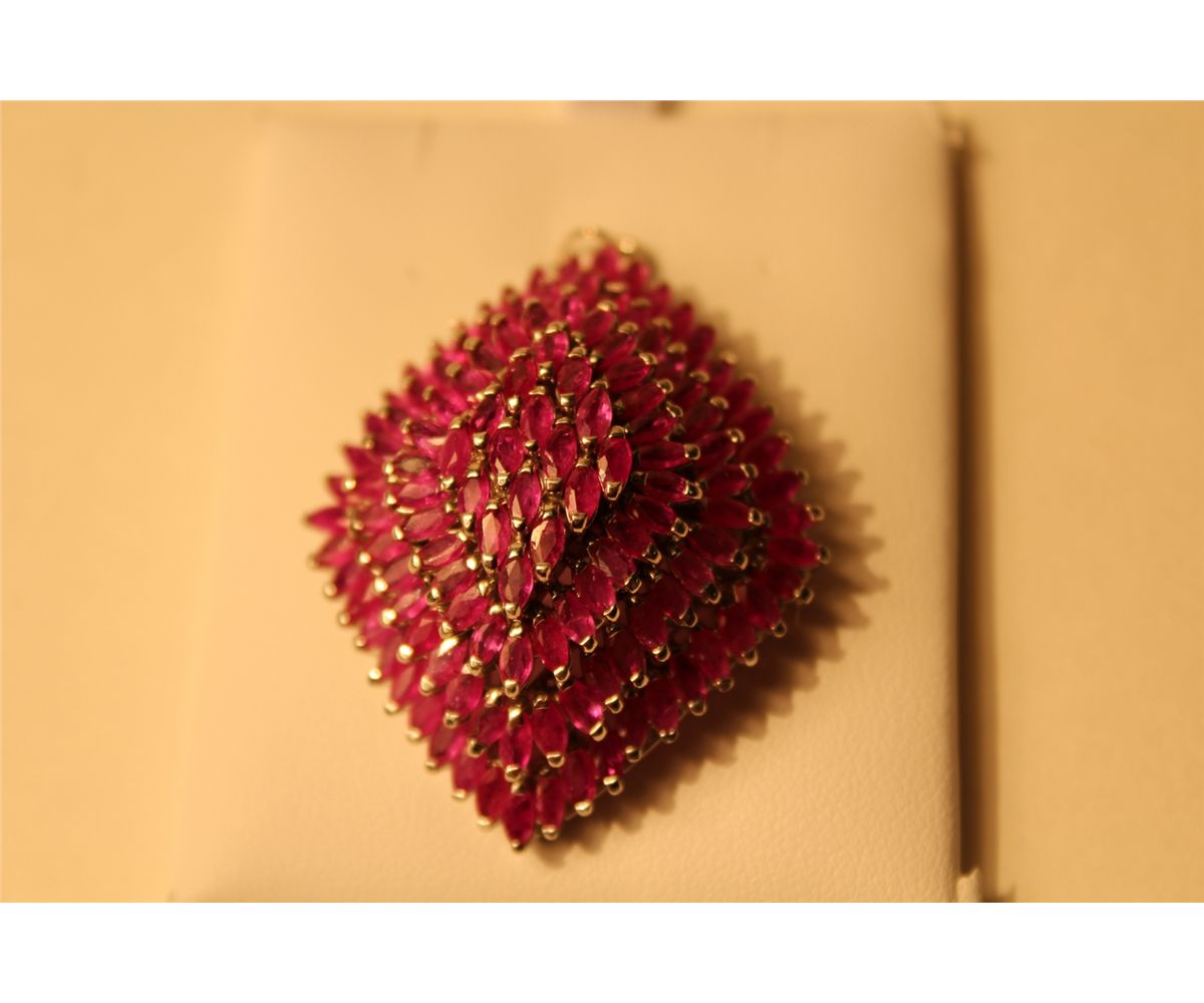 ONE STERLING SILVER MARQUISE SHAPED CLUSTER DESIGN PENDANT/BROOCH SET WITH A TOTAL OF BRIOLETTES.REPLACEMENT VALUE: $955 - 125 MARQUISE SHAPED NATURAL RUBIES APPROX. 13.25 CARATS. REPLACEMENT VALUE: $750.00