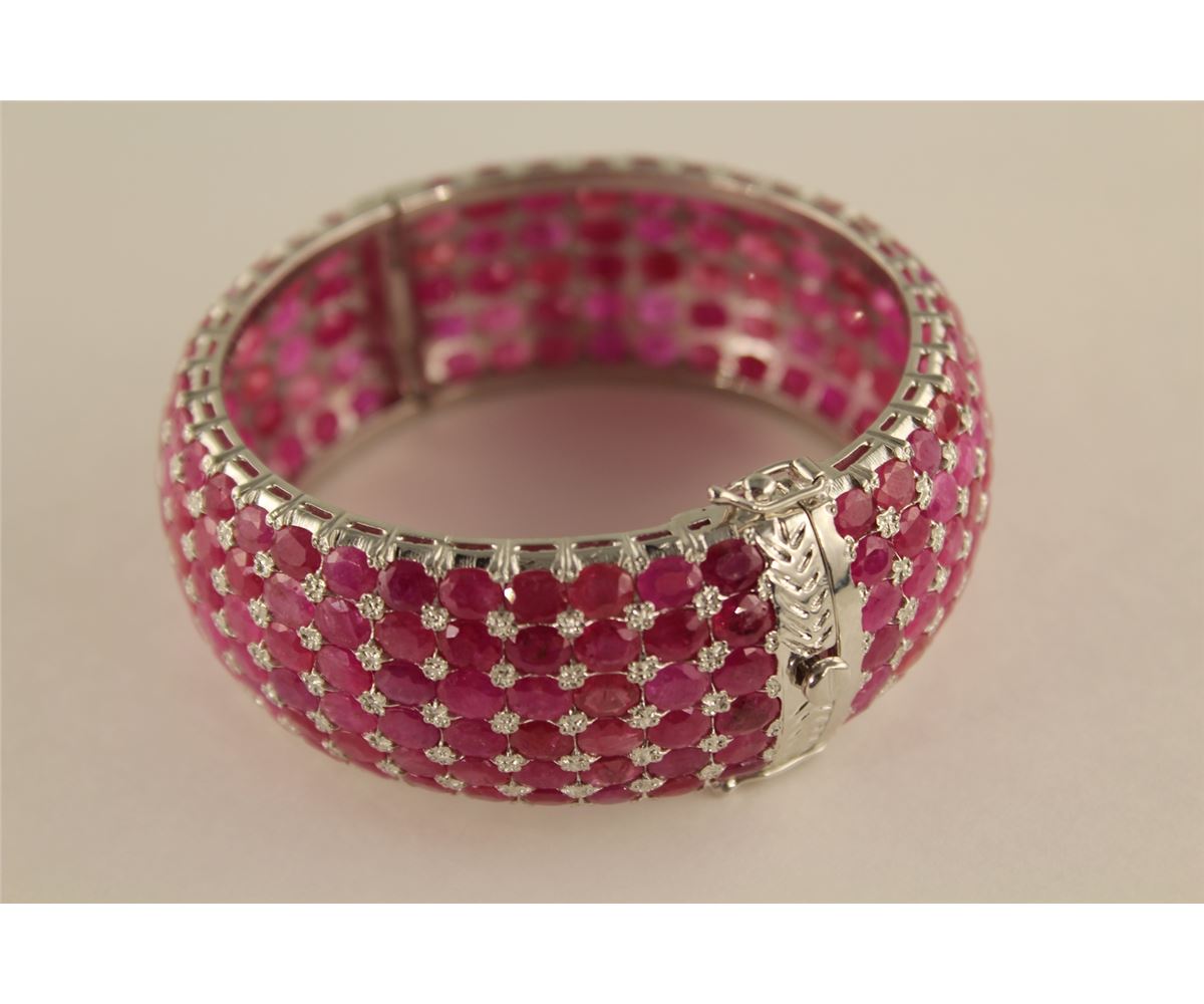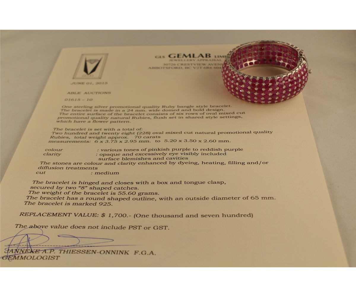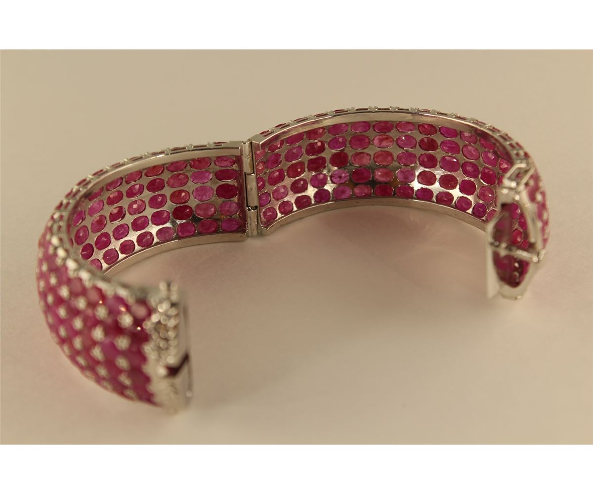 ONE STERLING SILVER PROMOTIONAL QUALITY RUBY BANGLE STYLE BRACELET SET WITH 228 OVAL MIXED CUT NATURAL PROMOTIONAL QUALITY RUBIES APPROX. 70 CARATS.  MARKED 925. REPLACEMENT VALUE:$1700.00