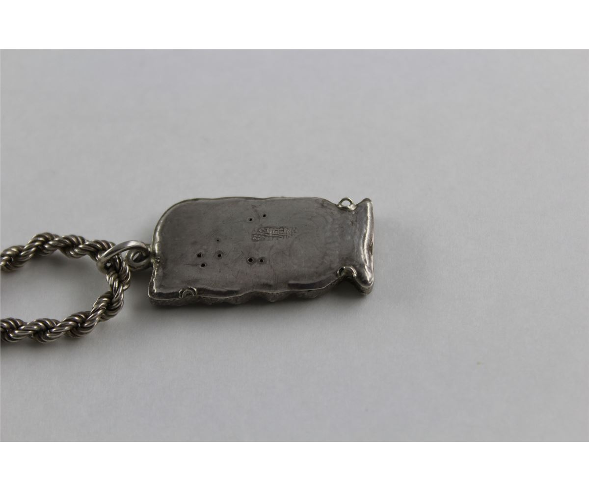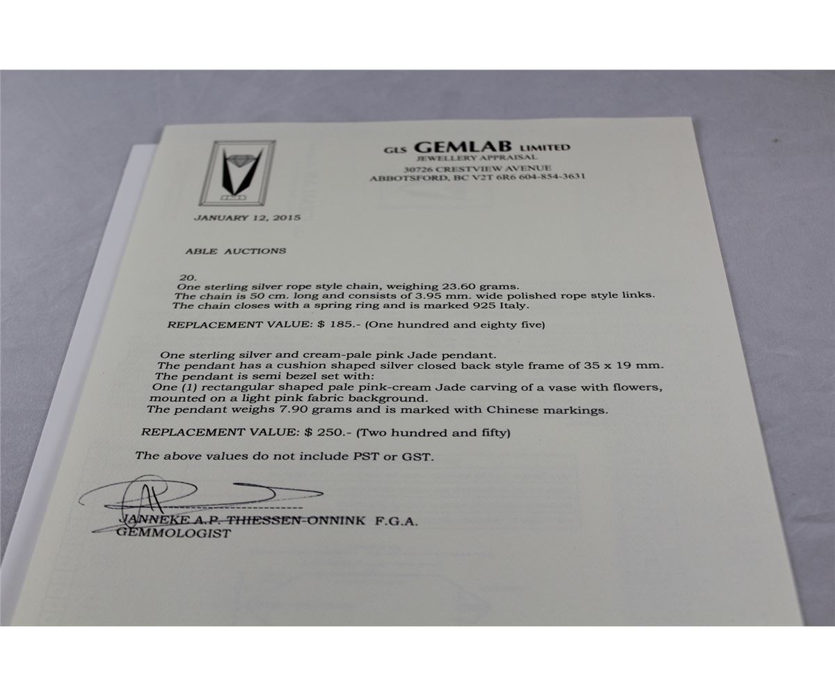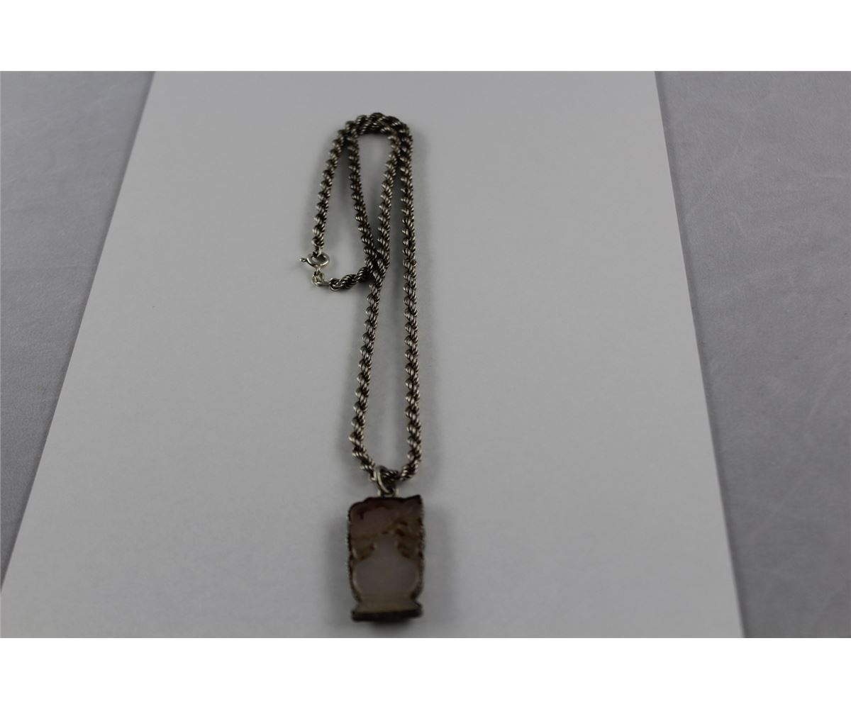 ONE STERLING SILVER ROPE STYLE CHAIN 50 CM LONG. MARKED 925 ITALY.REPLACEMENT VALUE: $185.00. ONE STERLING SILVER & CREAM-PALE PINK JADE PENDANT CARVED IN DESIGN OF A VASE WITH FLOWERS. REPLACEMENT VALUE:$ 415