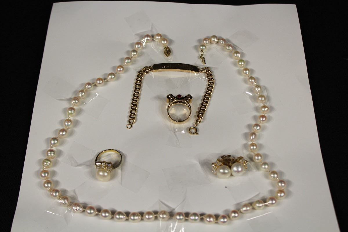 ONE STRAND OF BAROQUE SHAPED WHITE AKOYA CULTURED PEARLS RV $1,200, 14KT YELLOW GOLD ID BRACELET RV$600, VINTAGE 14KT YELLOW GOLD ART DECO BOW TIE DESIGN SYNTHETIC RUBY & DIAMOND RING RV $900, SET OF YELLOW GOLD PLATED WHITE FRESH WATER CULTURED PEARL RING & MATCHING EARRINGS