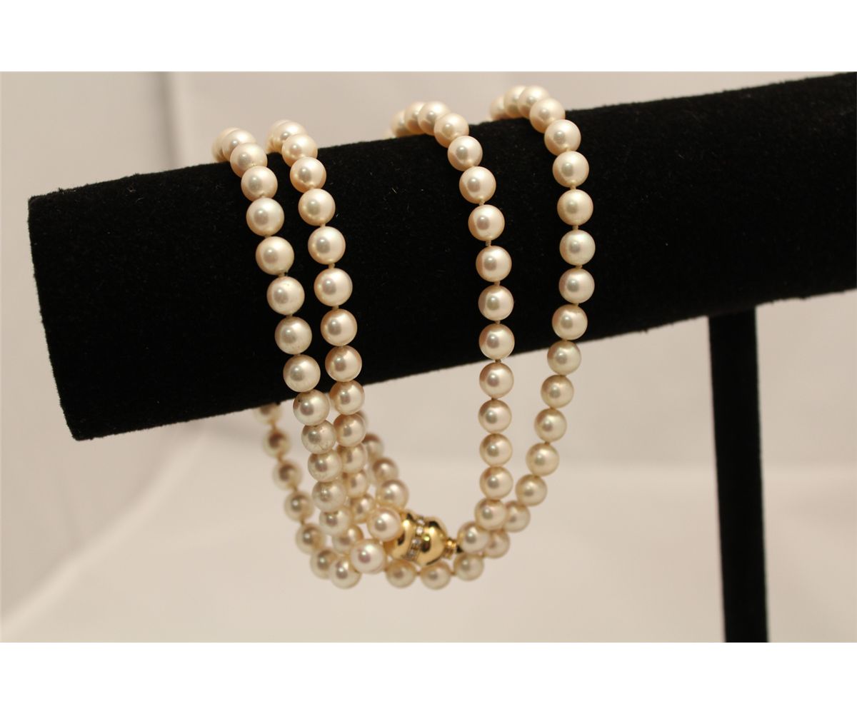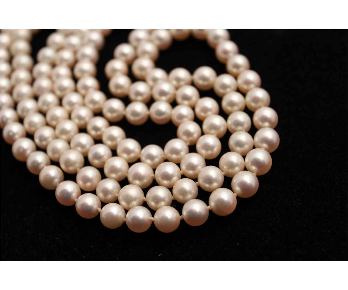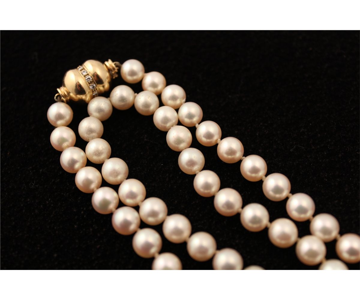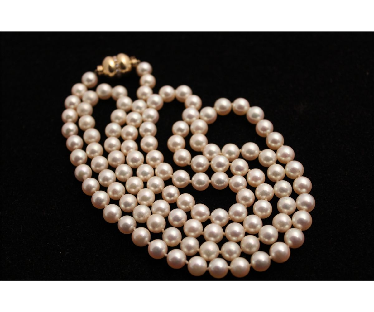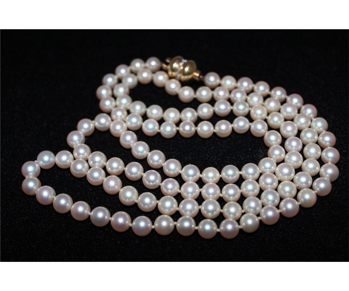 ONE STRAND OF ROUND WHITE JAPANESE AKOYA CULTURED PEARLS, CONSISTING OF PEARLS WITH THE FOLLOWING DESCRIPTION: DIAMETER: 6.90 - 7.20 MM COLOUR: FINE WHITE WITH A ROSE OVERTONE LUSTRE: GOOD CLARITY: GOOD NACRE THICKNESS: VERY GOOD SHAPE: WELL ROUNDED THE STRAND CONSISTS OF ONE HUNDRED AND FOURTEEN (114) PEARLS TOTAL AND IS KNOTTED TO A LENGTH OF 91 CM. THE STRAND CLOSES WITH A 18KT YELLOW GOLD DIAMOND SET OVAL DOMED DESIGN CLASP, WHICH IS BEAD WITH TWELVE (12) ROUND BRILLIANT CUT DIAMONDS TOTAL 0.25 CARAT. INCL. GEMOLOGIST APPRAISAL WITH REPLACEMENT VALUE OF $7,900