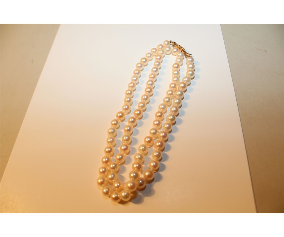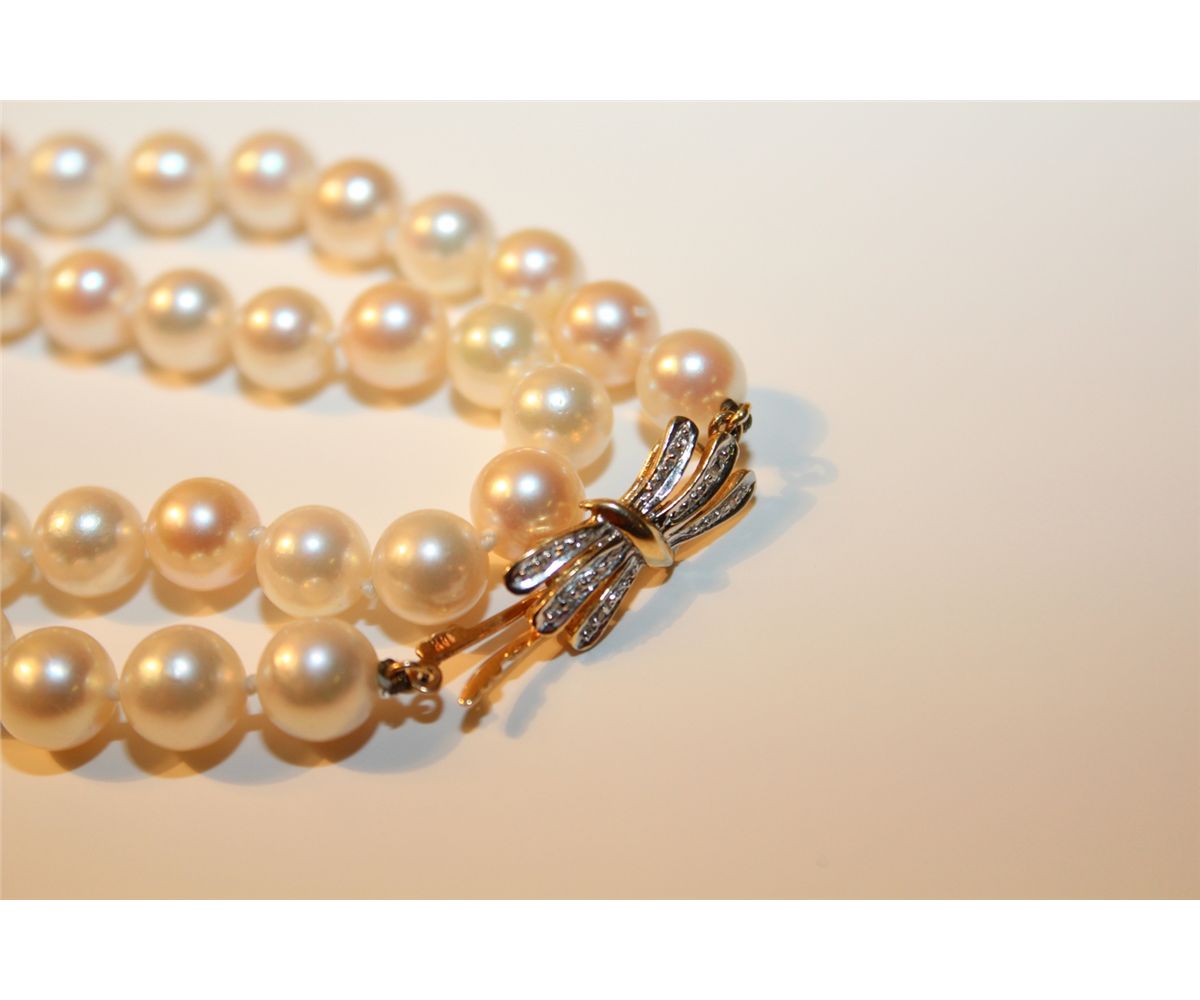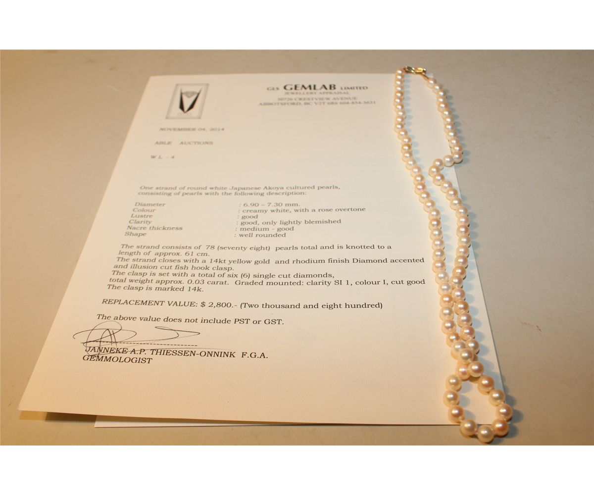 ONE STRAND OF ROUND WHITE JAPANSESE AKOYA CULTURED PEARLS KNOTTED TO A LENGTH OF APPROX. 61 CM WITH 78 PEARLS TOTAL. CLOSED WITH A 14KT YELLOW GOLD & RHODIUM FINISH DIAMOND ACCENTED AND ILLUSION CUT FISH HOOK CLASP. CLASP SET WITH 6 DIAMONDS APPROX. 0.