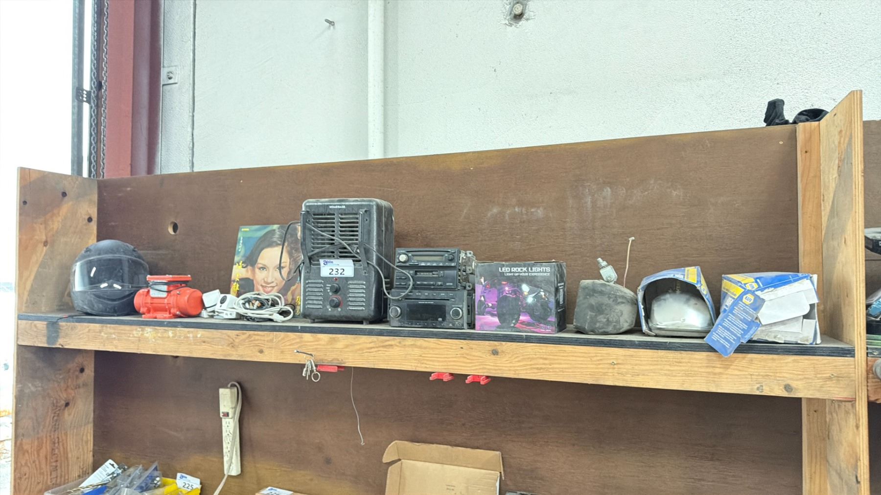 ONE TOP SHELF SECTION OF MISCELLANEOUS ITEMS - MOTOR CYCLE HELMET, CAR PARTS, HEATER AND LP'S