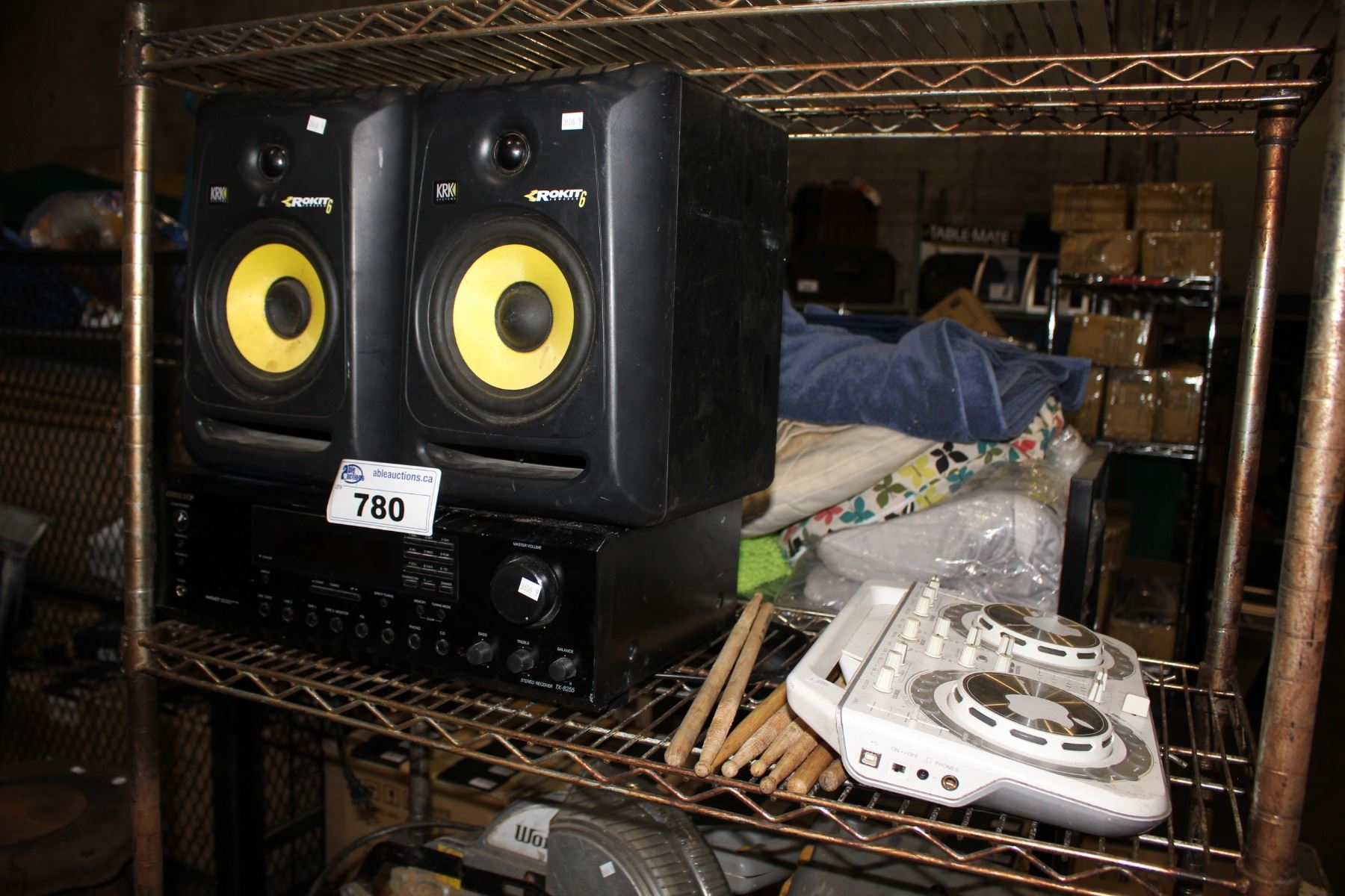ONKYO RECEIVER WITH SPEAKERS, DRUM STICKS AND AUDIO MIXER