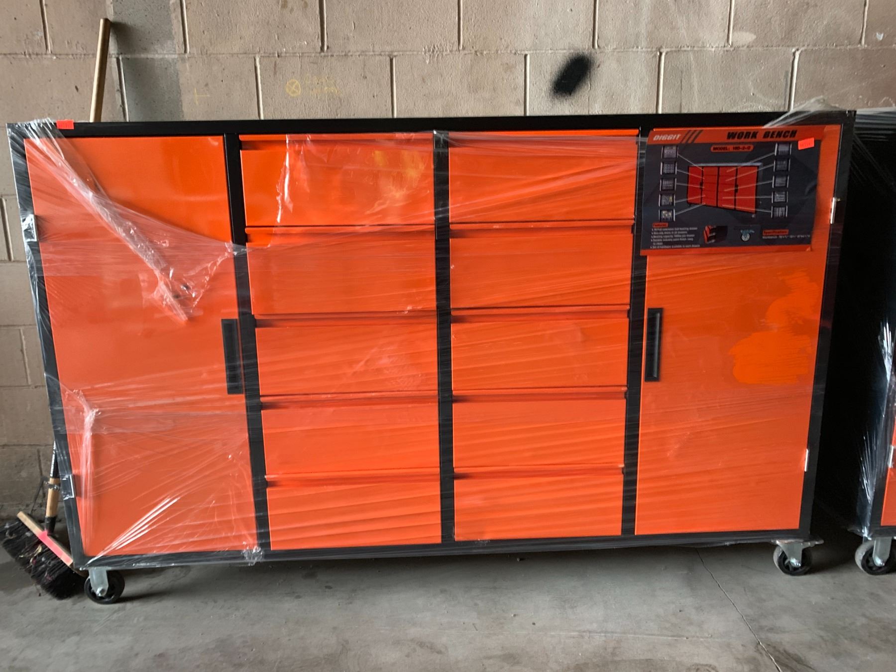 ORANGE / BLACK 10 DRAWER 2 DOOR 77"W X 20"D X 49"H MOBILE WORK BENCH WITH ASSORTED TOOL CONTENTS & LINED DRAWERS