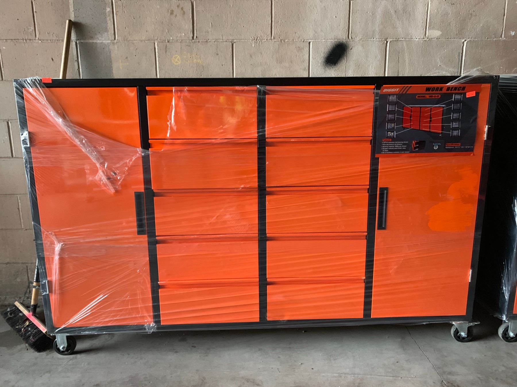 ORANGE / BLACK 10 DRAWER 2 DOOR 77"W X 20"D X 49"H MOBILE WORK BENCH WITH ASSORTED