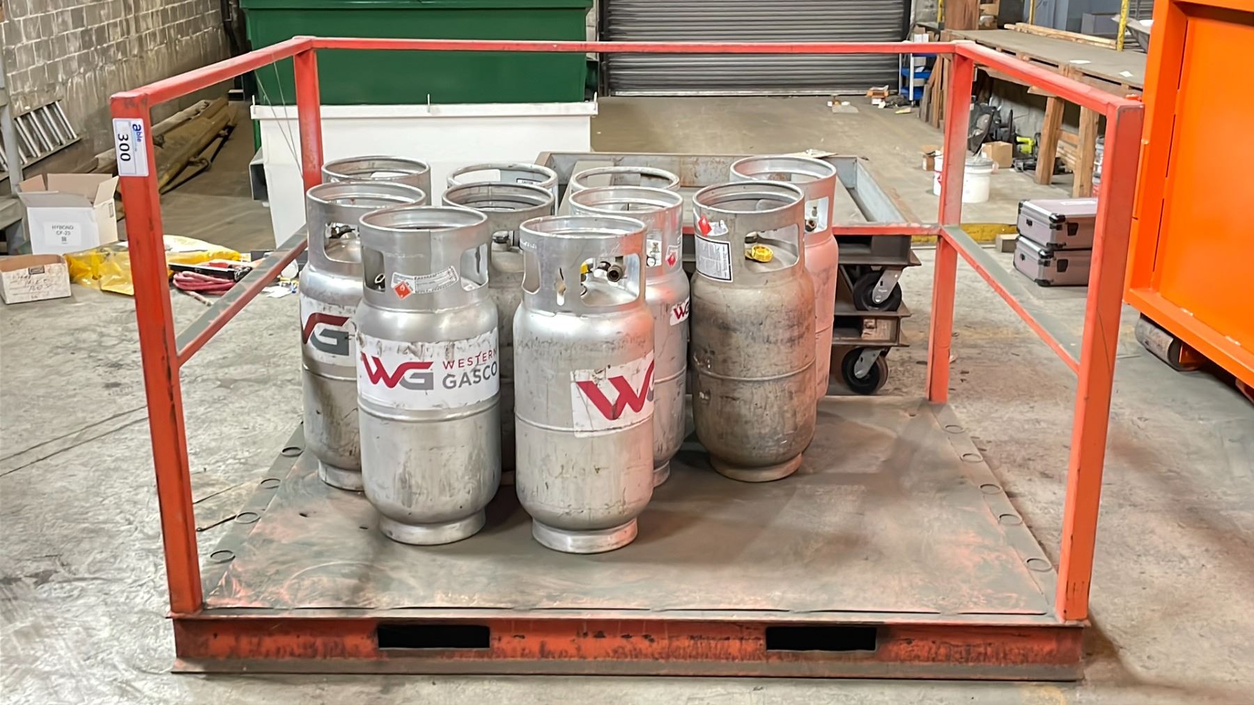 ORANGE METAL MATERIAL LIFTING PLATFORM WITH 3 RAILINGS SIDE ONE OPEN SIDE APPROX 72"L X 51"WX 45"H *TANK NOT INCLUDED*
