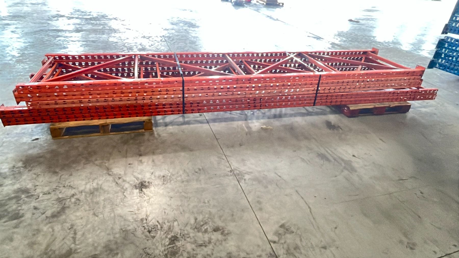 ORANGE PALLET RACKING UPRIGHTS (5 PCS.) - (3) 16'H X 42"W & (2) 18'H X 42"W WITH 6" X 6" AND 6 1/2" X 4" (1/8" & 1/4") BASES