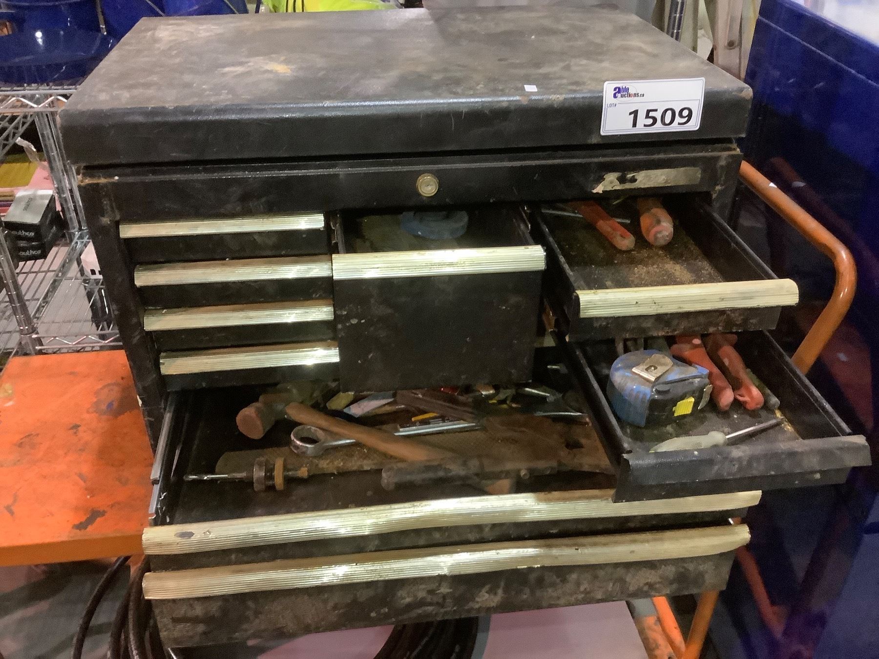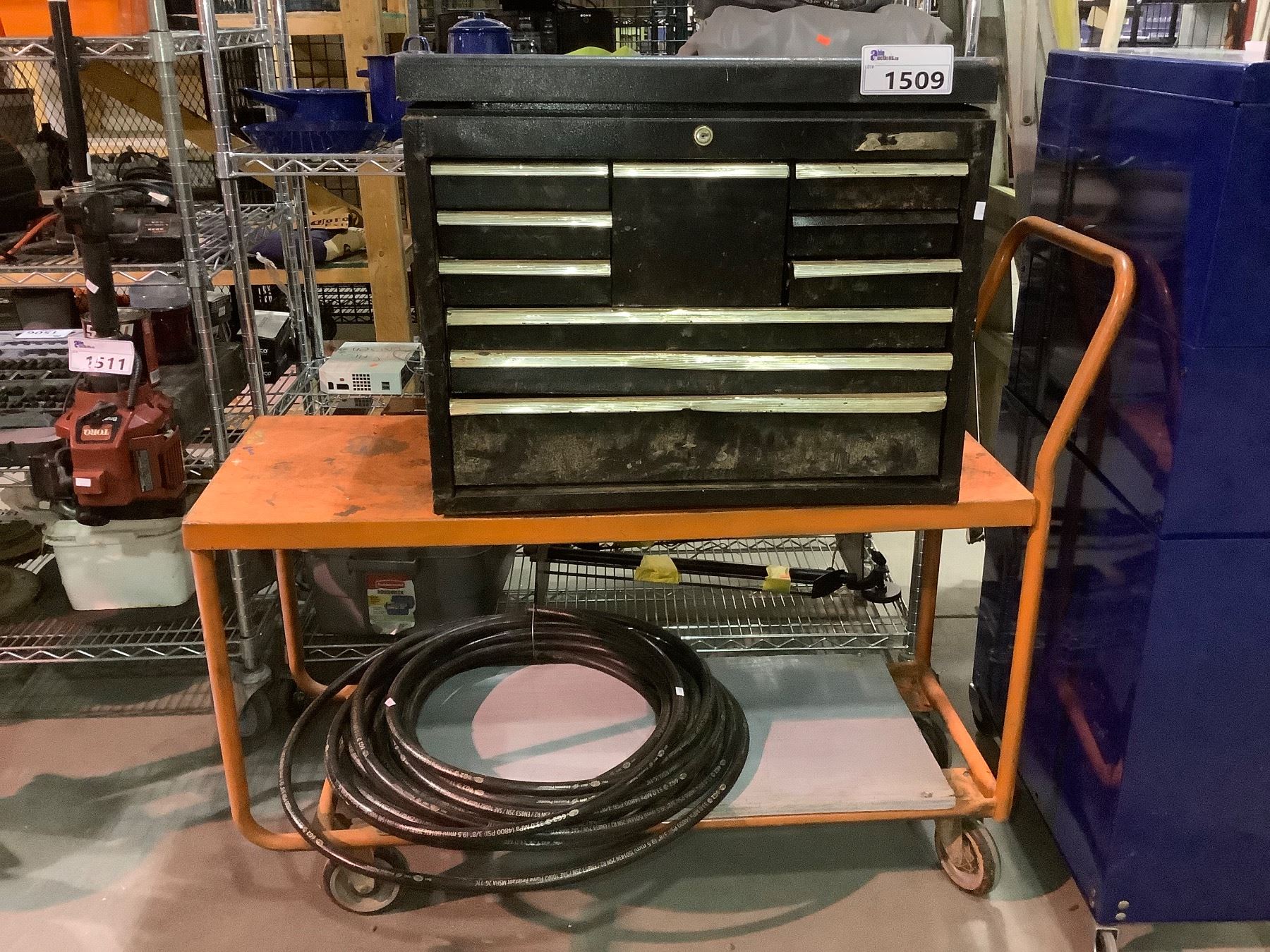 ORANGE ROLLING CART WITH FLAME RESISTANCE HOSE AND TOOL ORGANIZER WITH CONTENTS