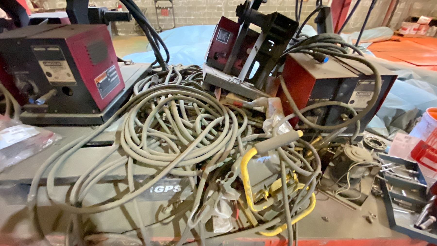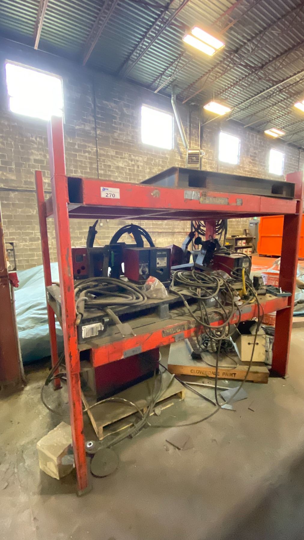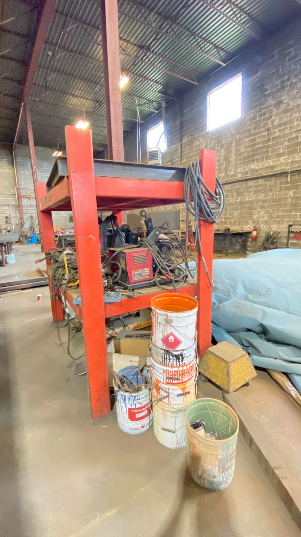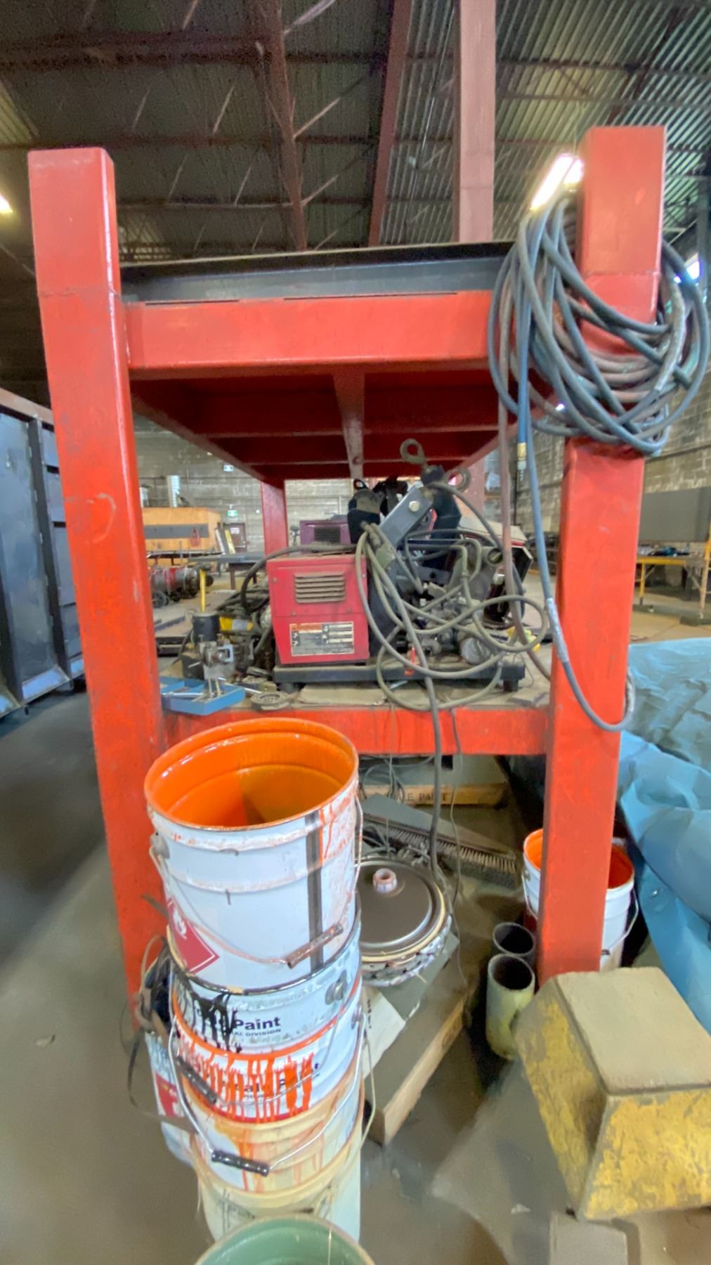 ORANGE STEEL SHELVING UNIT WITH CONTENTS, WELDERS, FEEDERS, PARTS, BINS, HOSES & MORE