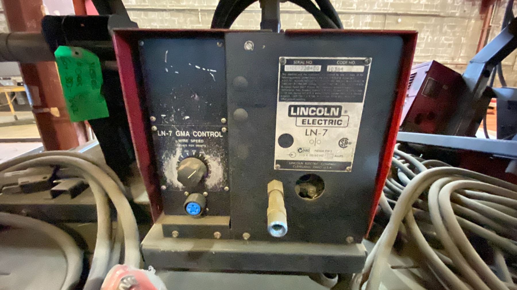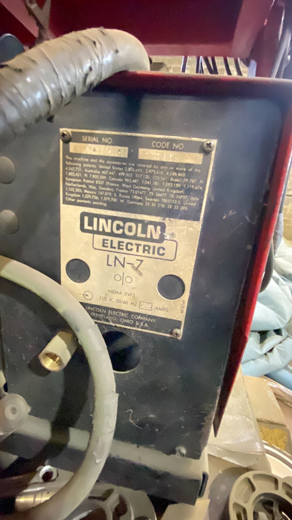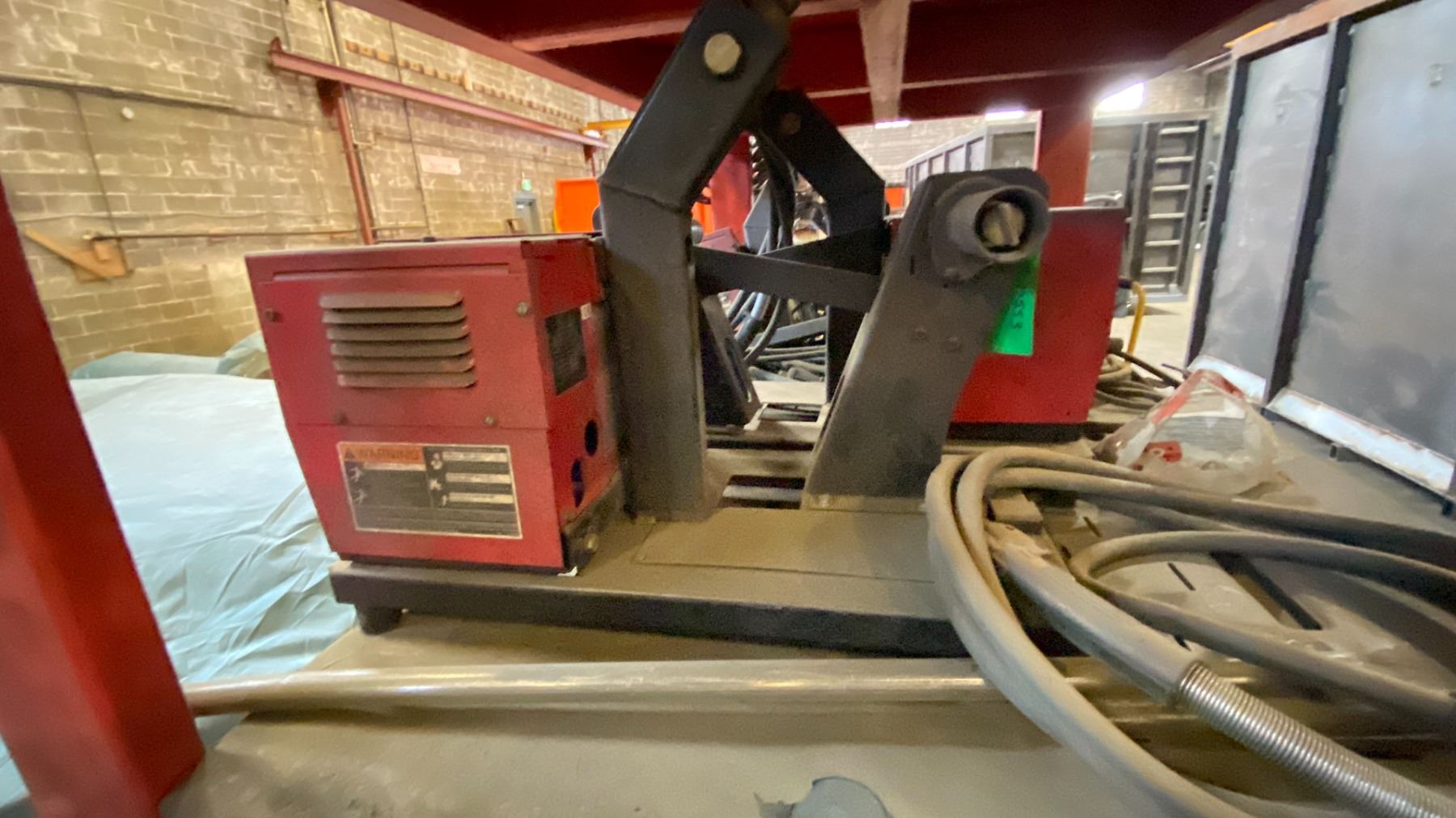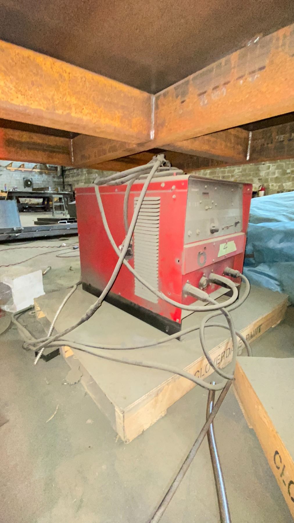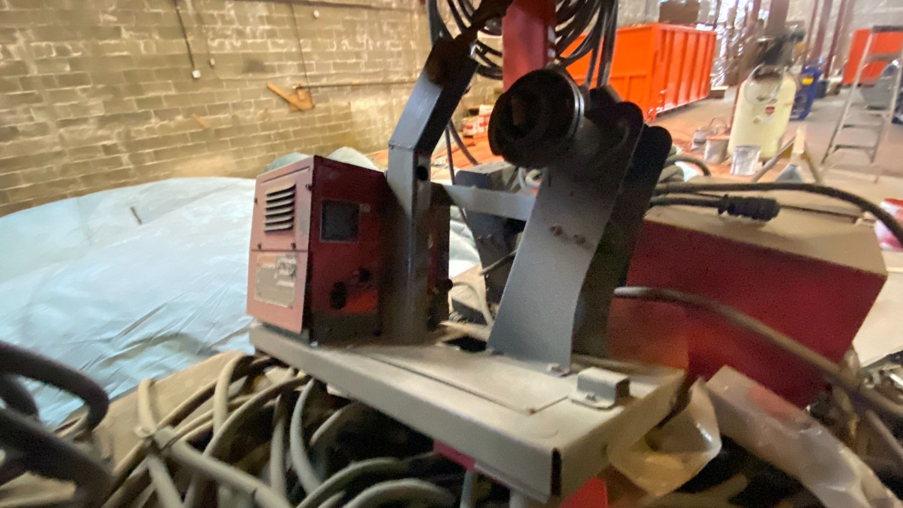 ORANGE STEEL SHELVING UNIT WITH CONTENTS, WELDERS, FEEDERS, PARTS, BINS, HOSES & MORE