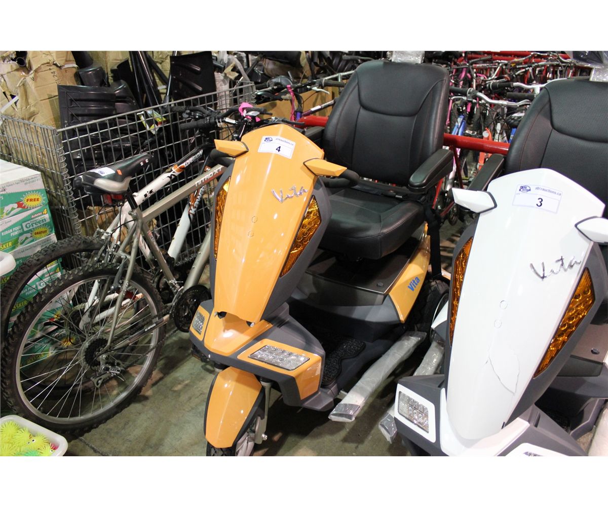ORANGE VITA 3 WHEELED MOBILITY SCOOTER ( NO CHARGER AND SOME DAMAGE TO FRONT PANEL )