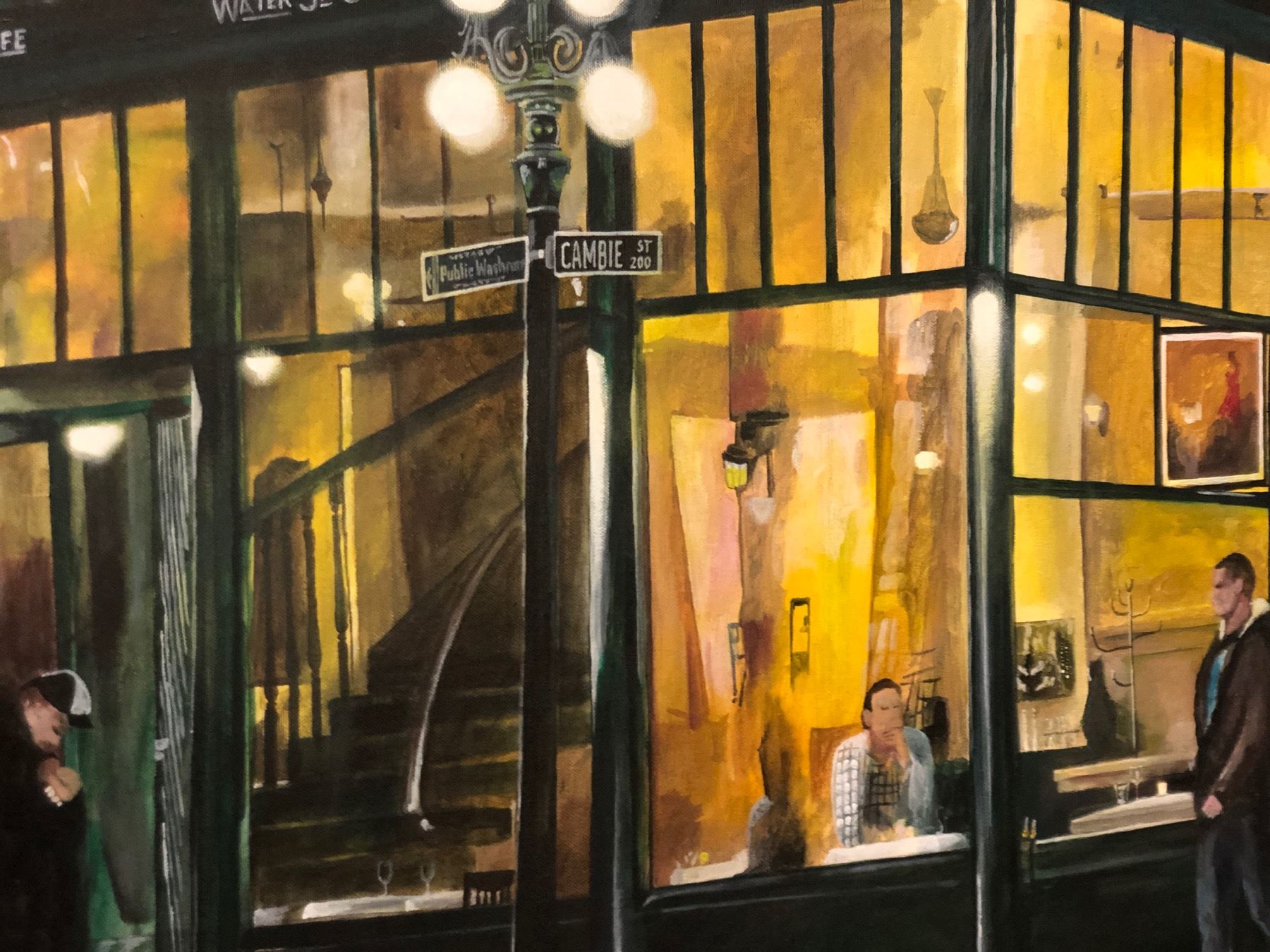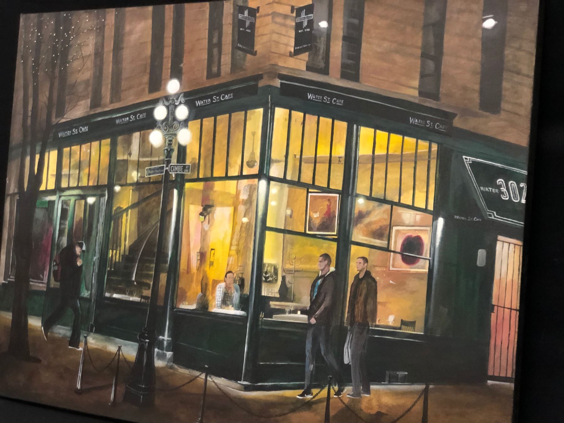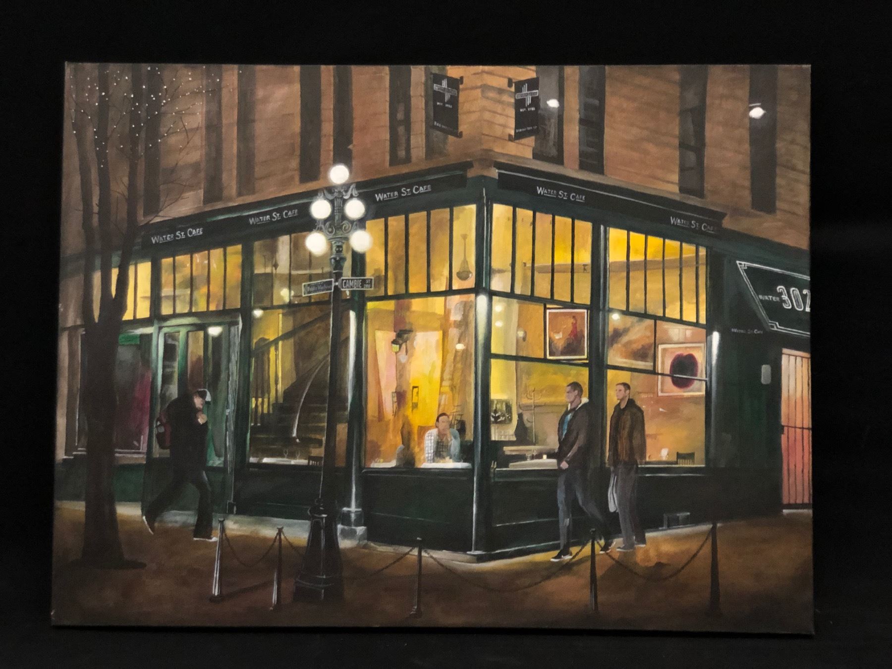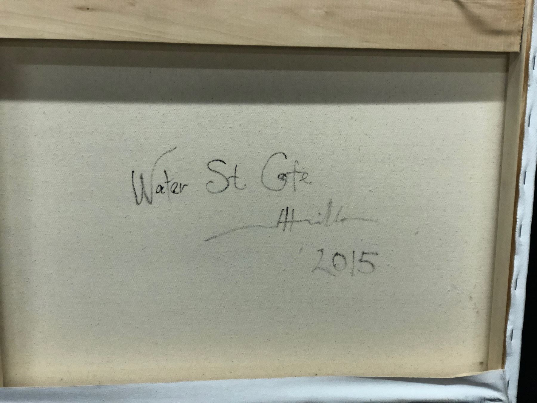 ORIGINAL ACRYLIC ON CANVAS, "WATER ST. CAFE", 2015, UNFRAMED, SIGNED ON BACK BY ARTIST, 30'' X 40''