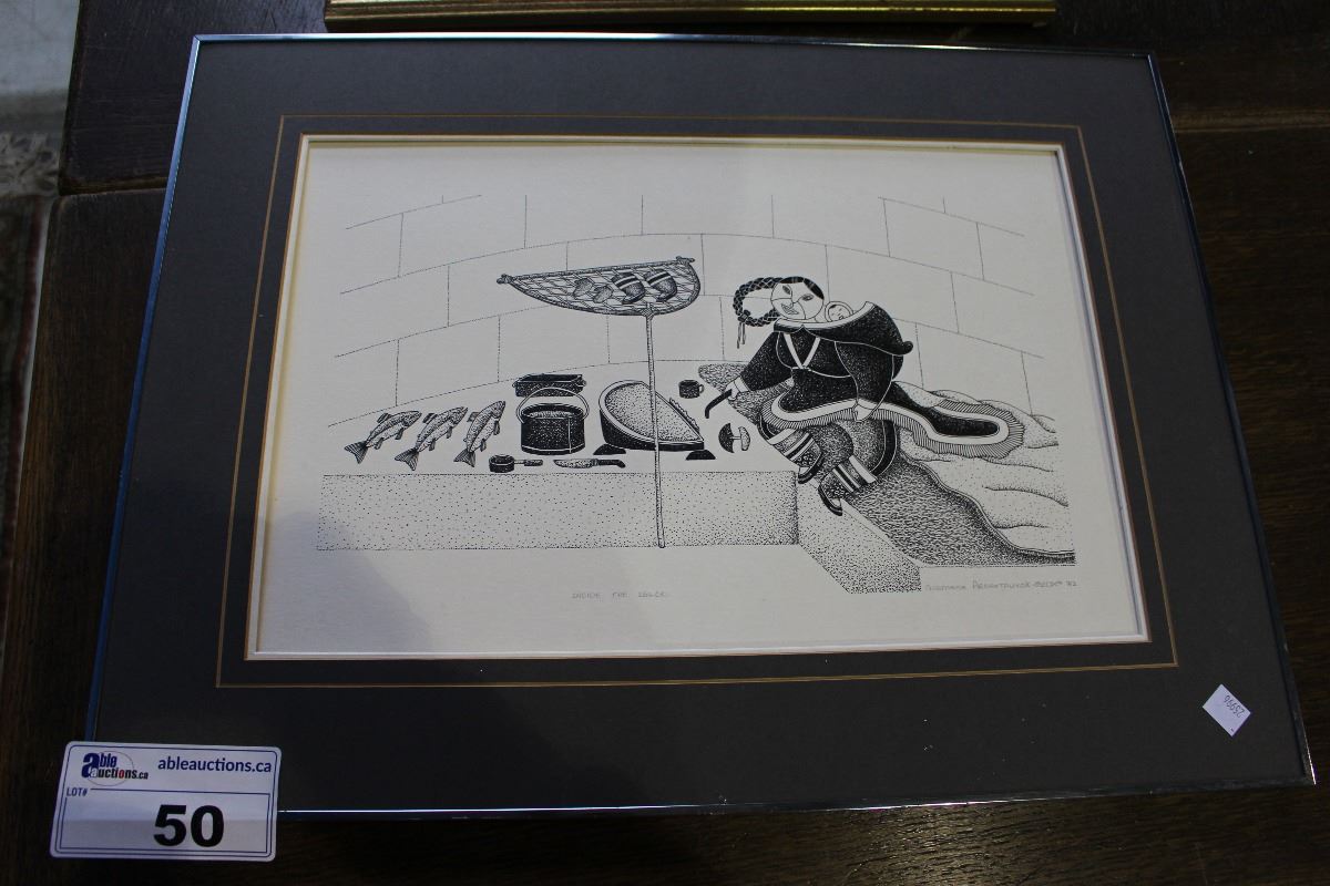 ORIGINAL INK ON PAPER, "INSIDE THE IGLOO", SIGNED LOWER RIGHT, GERMAINE ARNAKTAUVOK, 1982