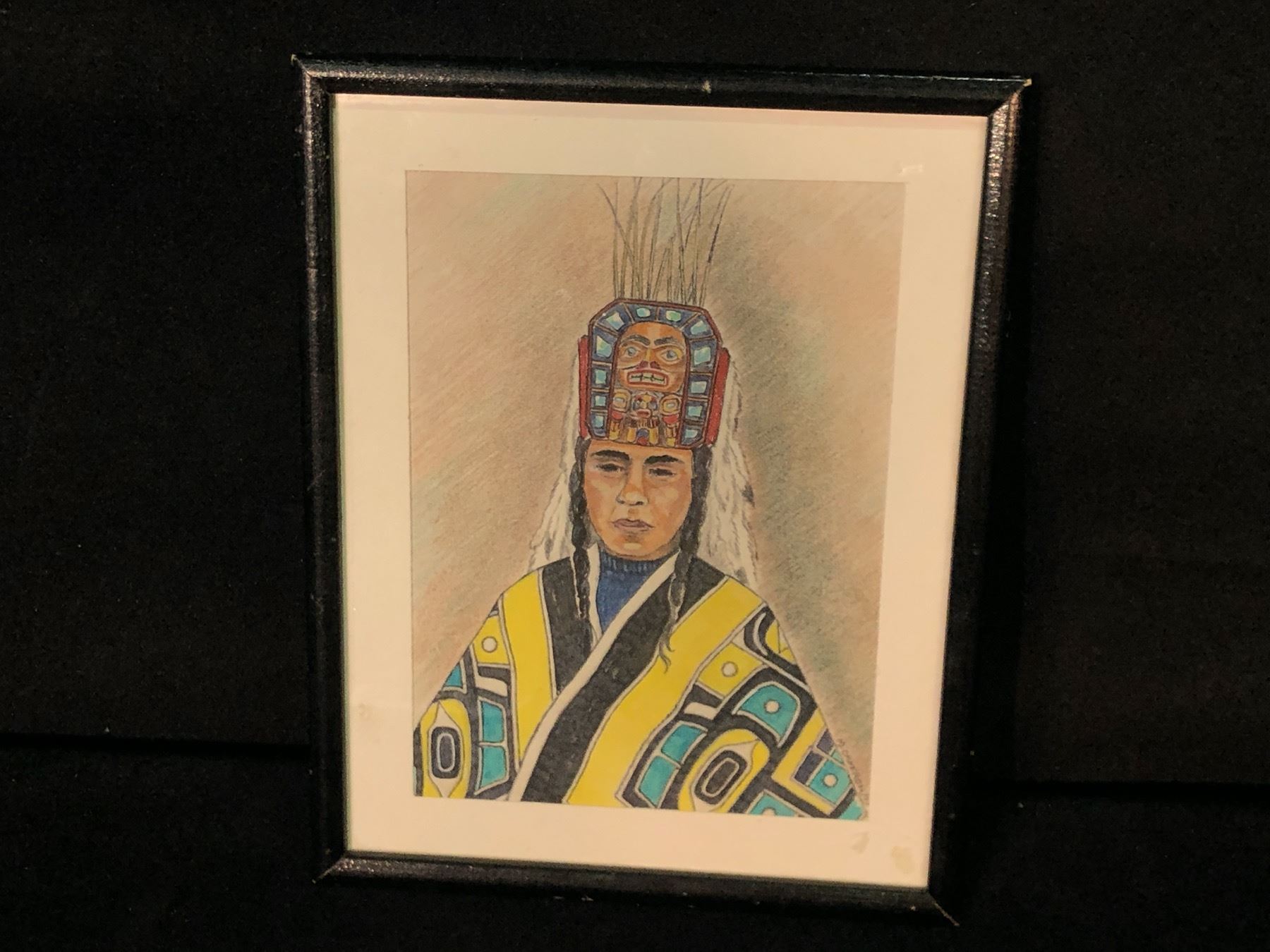 ORIGINAL MARY CAMERON DRAWING OF NORTHWEST CHIEF IN CEREMONIAL REGALIA, CHILKAT ROBE & FRONTAL HEADDRESS, SIGNED BY ARTIST, 12" X 9" INC. FRAME